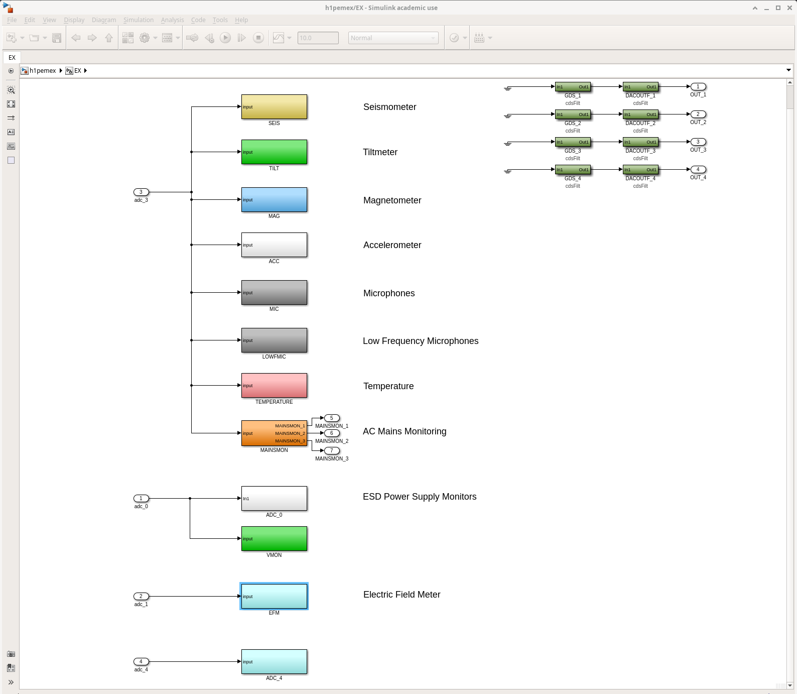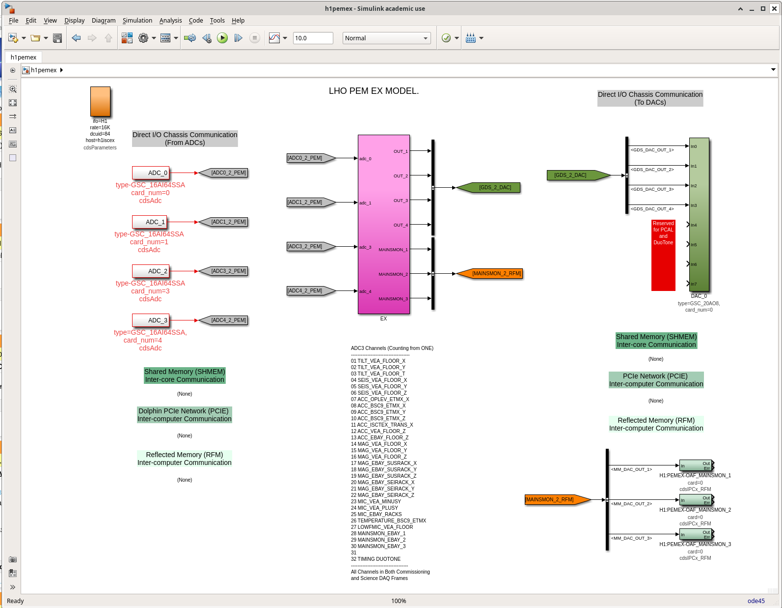 J. Kissel ECRs: E2400409 and E2500296 IIET: 35739 and 35706, respectively WP: 12901 DWG: D1002741 This morning, I updated the front-end user models for the X end station -- h1susetmx, h1susetmxpi, and h1sustmsx -- leveraging all the work and gotchas from yesterday's 32CH DAC upgrade of the Y-end station front end models (Primary models LHO:88280, Inconsequentially Updating Libraries LHO:88283, and Adding DAC compensation filters to the ETM PI library part LHO:88285). The good thing about having the end-stations use identical wiring diagrams means that I can literally copy and paste the digital representations of the DAC connections and cards. I've confirmed that the library part change to the ETM PI library correctly updated in the h1susetmxpi model without effort. The only "difference" was that the top level of the ETMX QUAD model, h1susetmx, had all of the messy prototyping pick-off infrastructure for the early 32CH DAC testing which can now all be ripped out and made to look clean and simple like ETMY's. I attach before vs. after screenshots for posterity. The revisions of the models that have been successfully compiled: /opt/rtcds/userapps/release/sus/h1/models/ h1susetmx.mdl r28431 --> r34046 BEFORE vs AFTER sus/common/models/ESD_LINEARIZATION_WITH_CHARGE_MASTER.mdl : r16336 --> r30316 h1susetmxpi.mdl r27215 --> r34048 BEFORE vs AFTER sus/common/models/PI_MASTER_V2.mdl : r26600 --> r34033 h1sustmsx.mdl r27182 --> r34050 BEFORE vs AFTER And as before, I also attach a screenshot of the usage of DAC0 and DAC1 across front-end models. Today I decided to be a little more color-coded with my notes on channel usage; red for consumed/reserved in other models, orange for actually physically unused.
