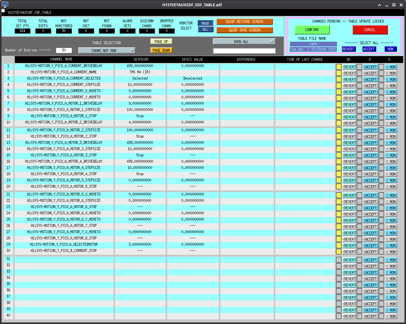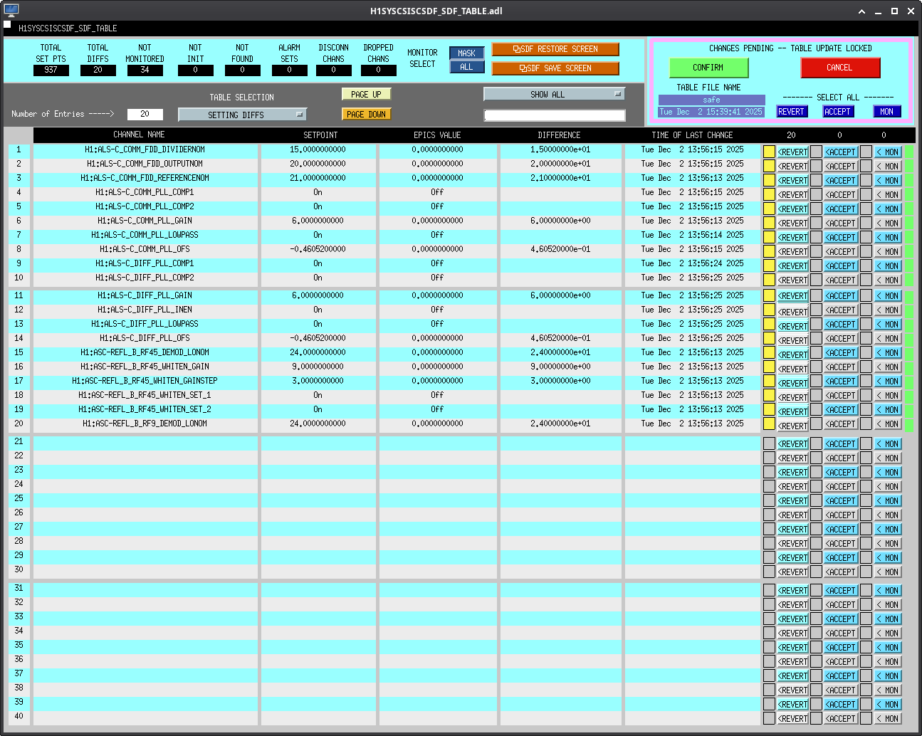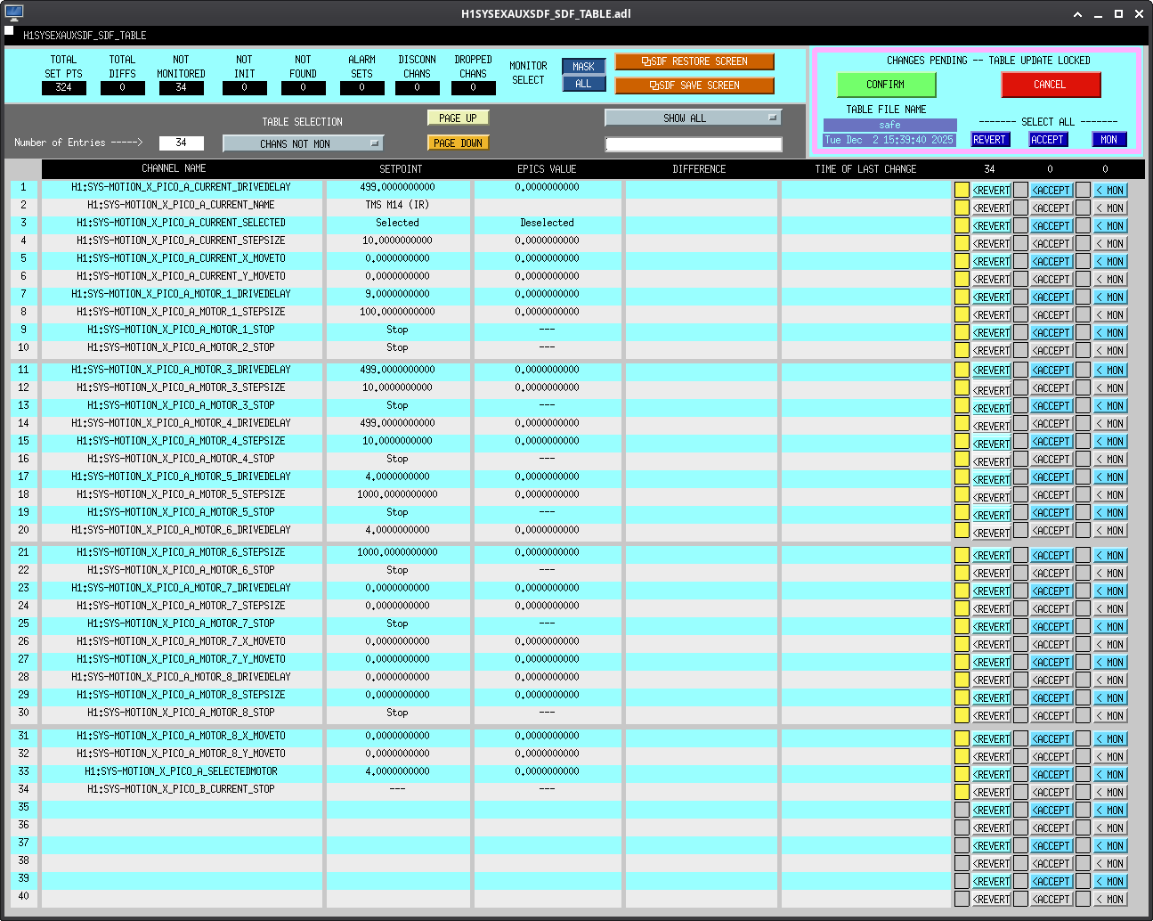 As a reminder (for myself and others), when a Beckhoff computer is restarted, its settings are brought back up according to an internal settings file on that computer, NOT according to the safe.snap SDF table, unlike a traditional frontend model. This means the SDF tables for the restarted Beckhoff computers (basically anything with SYS in the name) will show several differences, that in most cases should be REVERTED. It's also useful to check the not monitored channels for differences, as we found a few of those today, although they were mostly just picomotor settings. See attached screenshots.