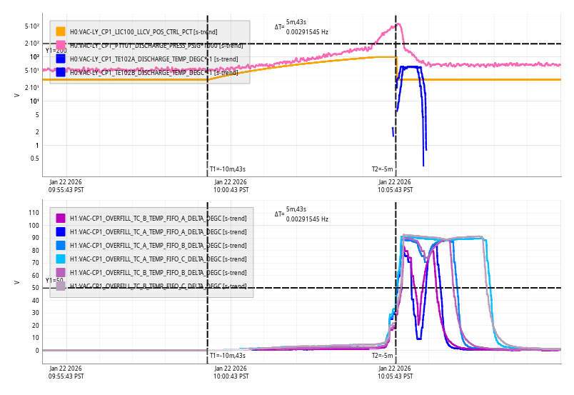 The problem: during the winter months the TCs start with a positive temp, dropping to around -70C when LN2 is flowing. To show the TCs along with the discharge line pressure and LLCV on the same plot the TC signals are inverted and then all are ploted logarithmically. This means the baseline (positive)temps are now negative which is not shown on a log plot, and when crossing zero they force many divisions in the autoscaled log axis.