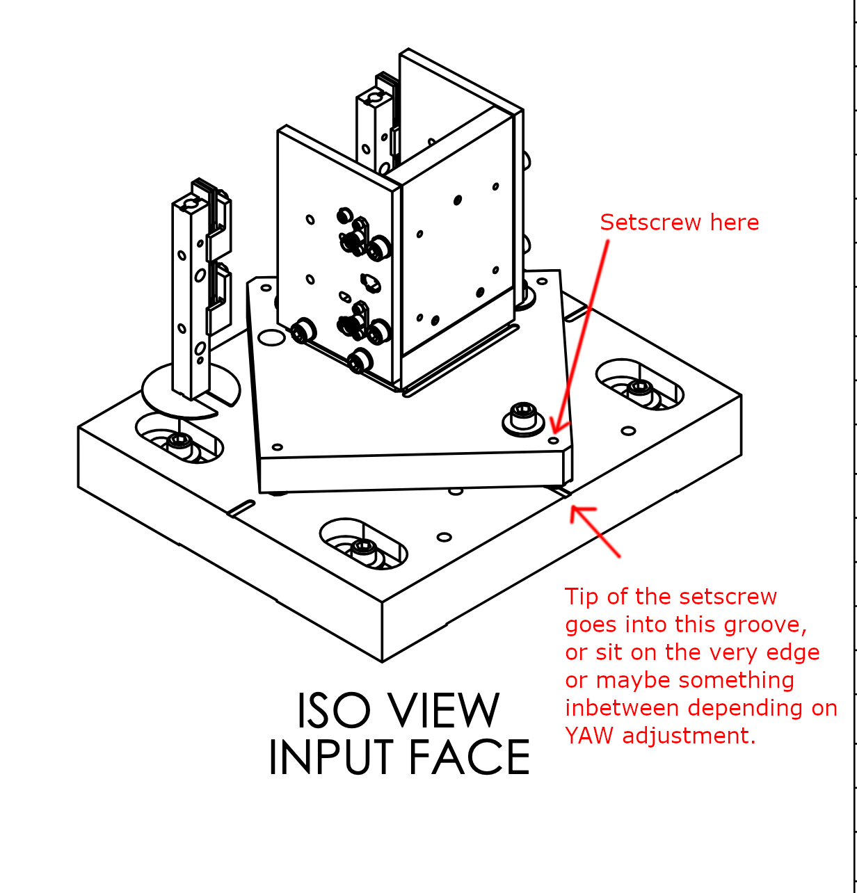 One of the roll adjustment set screw (8-32 oval point) is riding on top of the shallow groove that is 0.125" wide and 0.02" deep in the base plate. Depending on the YAW adjustment, the round tip of the screw might sit on the edge of the groove, making things unstable. FYI the standard diameter of 8-32 screw is 0.164" so it's wider than the recess, I don't know the exact profile of the oval point but the YAW adjustment range of this mount is smaller than it seemed at first to me.