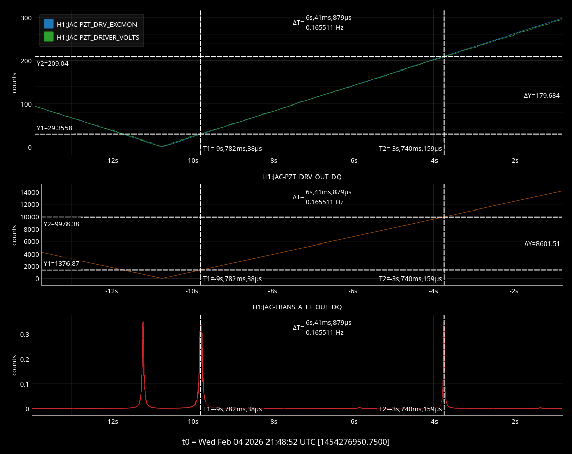 | MC2 trans | 310 counts | 90 counts | consistent with 60% HAM1 throughput measured with a power meter (extra loss due to temporary mirror for JM3) |