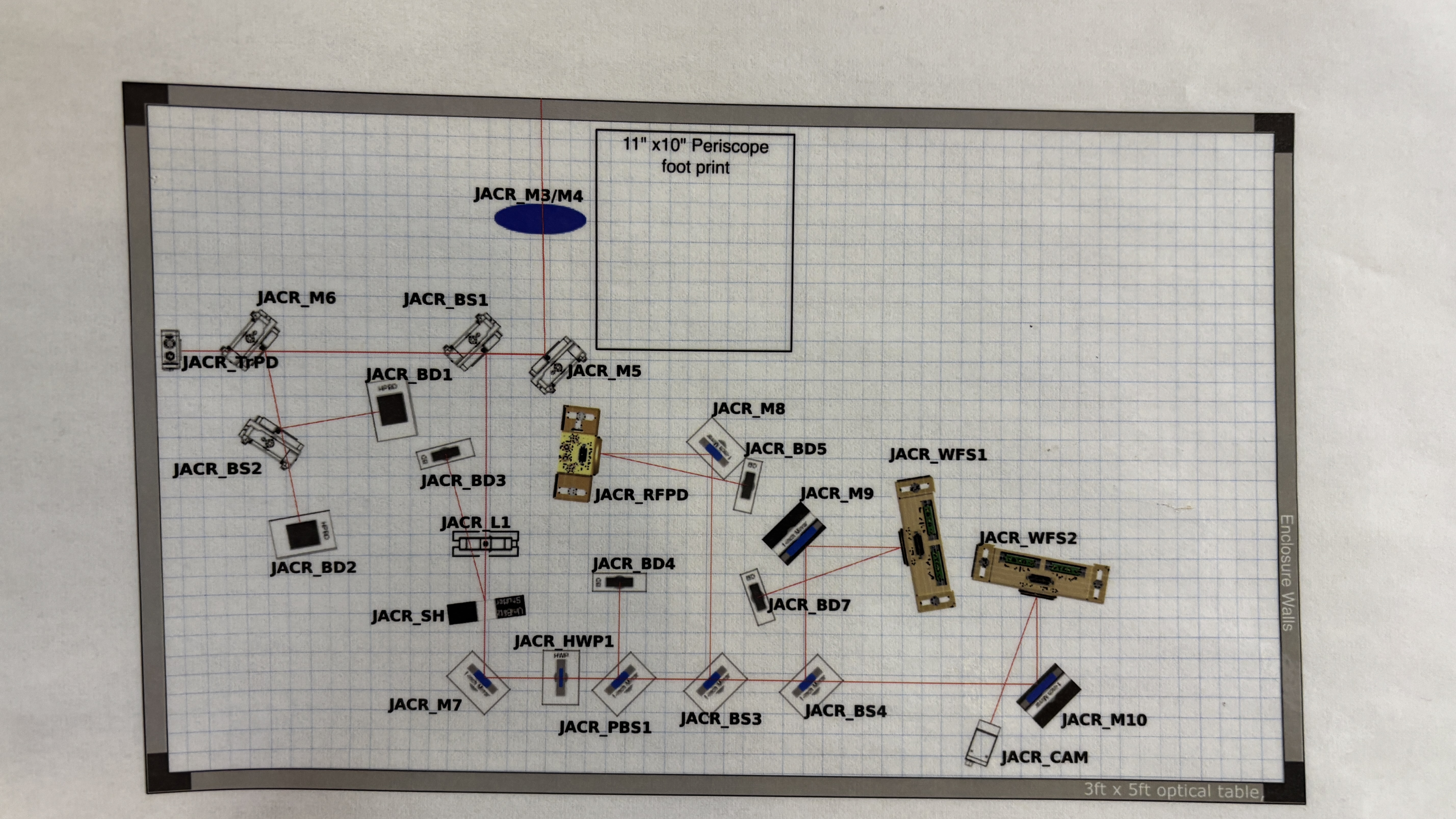We placed the components on the table according to the layout as close as possible, but some adjustments had to be made to account for things like cable routing or base sizes (for example, the singular GigE camera is not currently in its proposed position due to the network cable being hit by the table enclosure door; this will need to find a different spot). Routing of the RF cables for the WFS and picomotor cables may also need to be adjusted after final positions are decided. Many of the optics needed to be cleaned before being placed in their mounts. Two of the SMA connectors on the REFL PD were damaged to the point where cables could not be screwed in well enough, but Marc was able to fix these by (carefully) bending the connectors back with pliers. Once the door is back on HAM1 and the JAC reflected beam is exiting the viewport, we can move IOT1 into place and proceed with fine alignment of components on the table, after which the table layout should be updated with an "as-built" version.