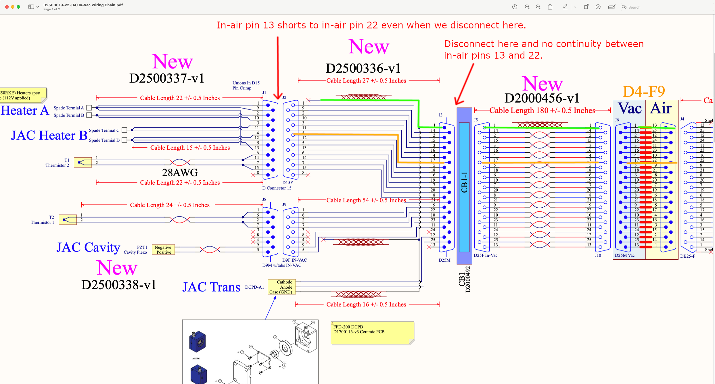 From outside of the chamber, using DB25 breakout board on D4-F10, when everything is connected in chamber, in-air pin 13 (shield of the cable inside the chamber) is shorted to pin 8, 9 and 22 with only 2 or 3 Ohm. These are all connected to Heater B Terminal D, which is one leg of the Heater B. In addition, pin13 and pin 10 and 23 show 54 Ohm, these are Heater B Terminal C, so this is expected (nominal resistance of the heater is 50 Ohm). Nothing is shorted to the chamber gound, which is a good news.