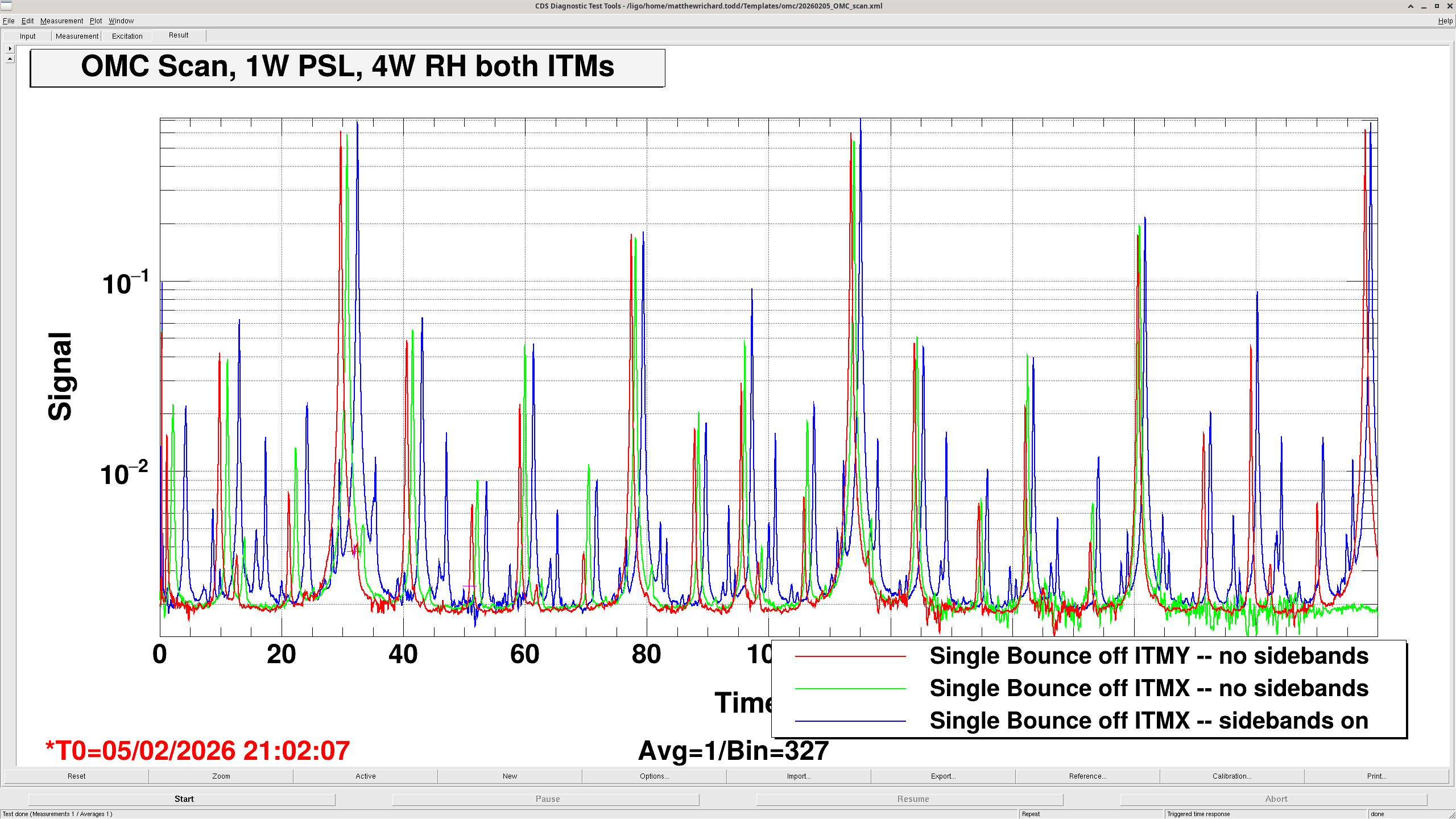 | OMC Scan - Single Bounce off of ITMX | 1454352294 | Cold | 0 | 2.45 | 0 | 0 | Mismatch = 20.2% | Sidebands on |