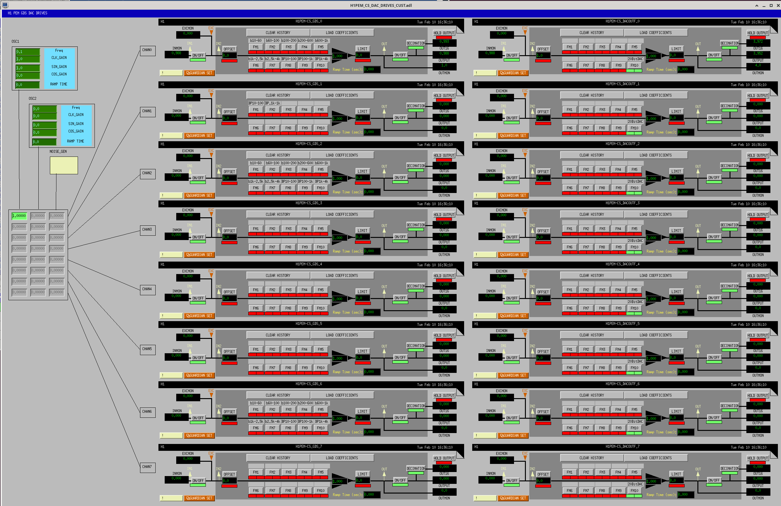 Attached image shows H1PEM_CS_DAC_DRIVES_CUST.adl MEDM which maps the excitation path from OSC/NOISE_GEN through the filters for each DAC channel. Note on DACOUTF, each FM10 has a 20BitDAC filter, which is a x4 gain.