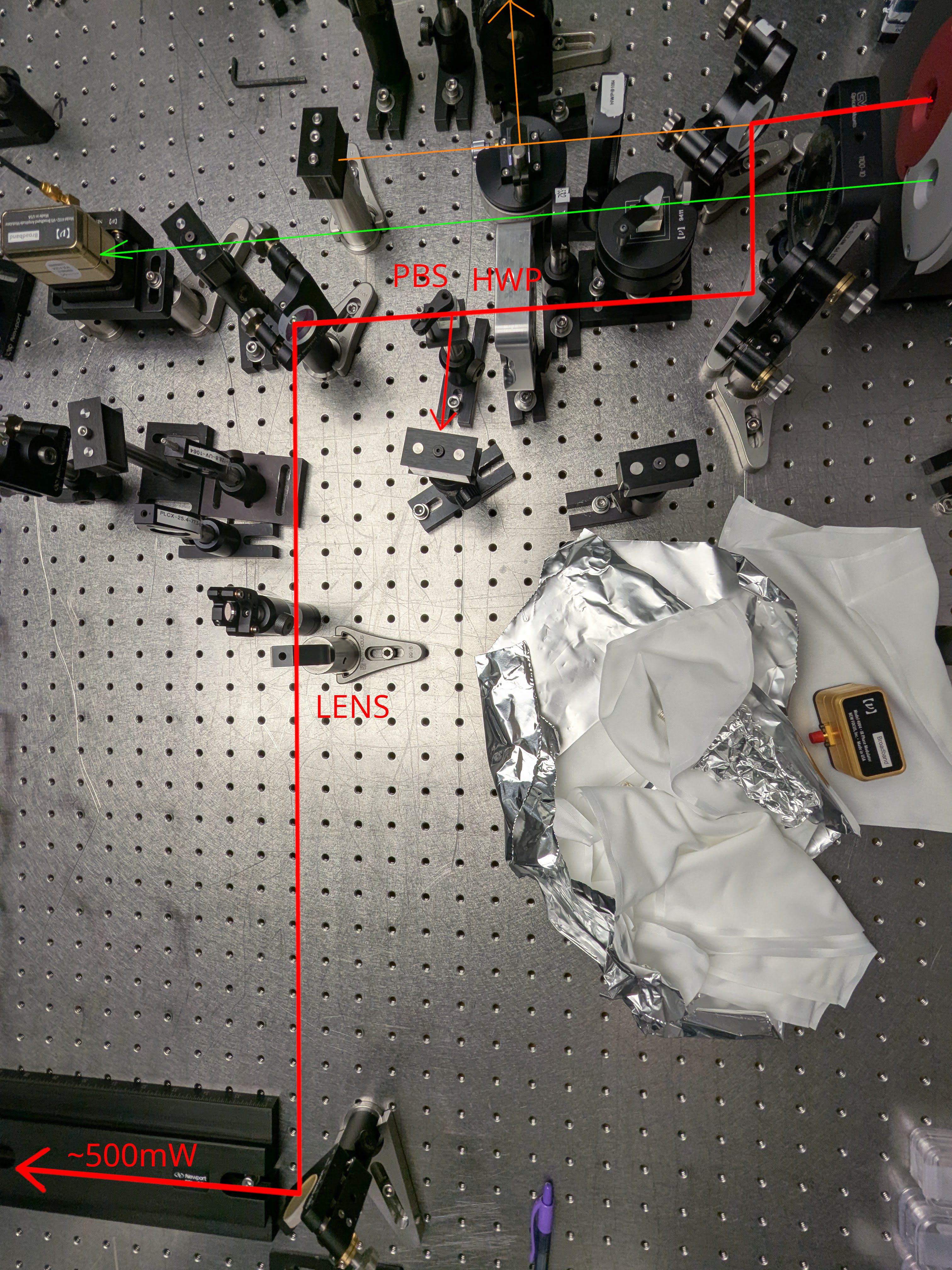 Since more power makes it easier to see the ghost beams, I removed the beam dump that used to receive most of the red power (~530mW) and directed the beam to the front of the table (red path in the attached). I stole the steering mirror that used to be used for the low power P-pol path (circled in red). The low power p-pol path is now simply blocked. No other change was made to low power S-pol path (orange) as well as green path (green), but the beams are blocked by beam dumps. If you want to use these, simply unblock.