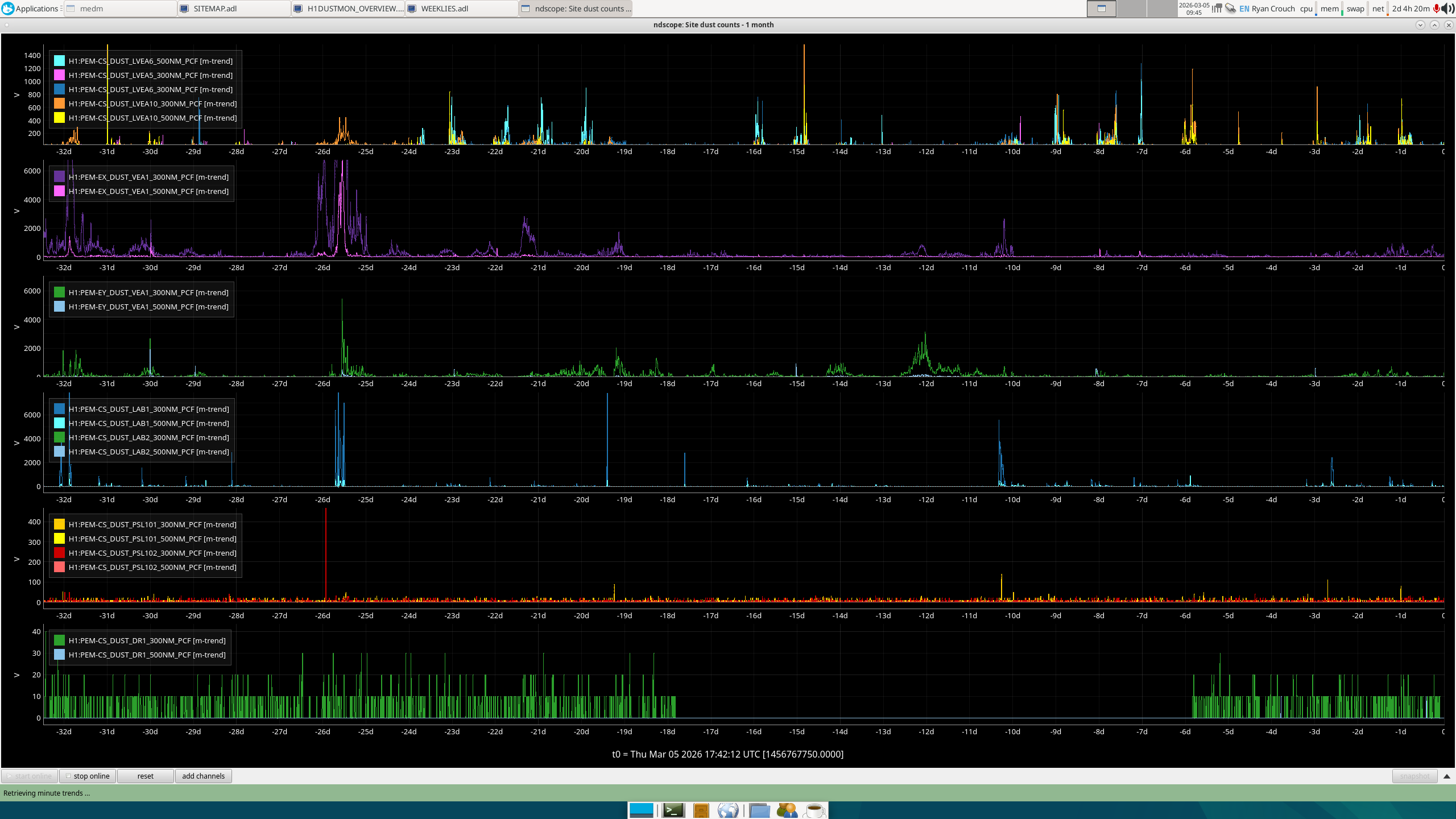 Everything looks as expected, no new issues. There was an odd dust spike (10 minutes of >1000 cts, so 2 cycles of sampling) from the PSL102 (Anteroom) dust monitor on Sat Feb 7th around 11:30 local.