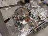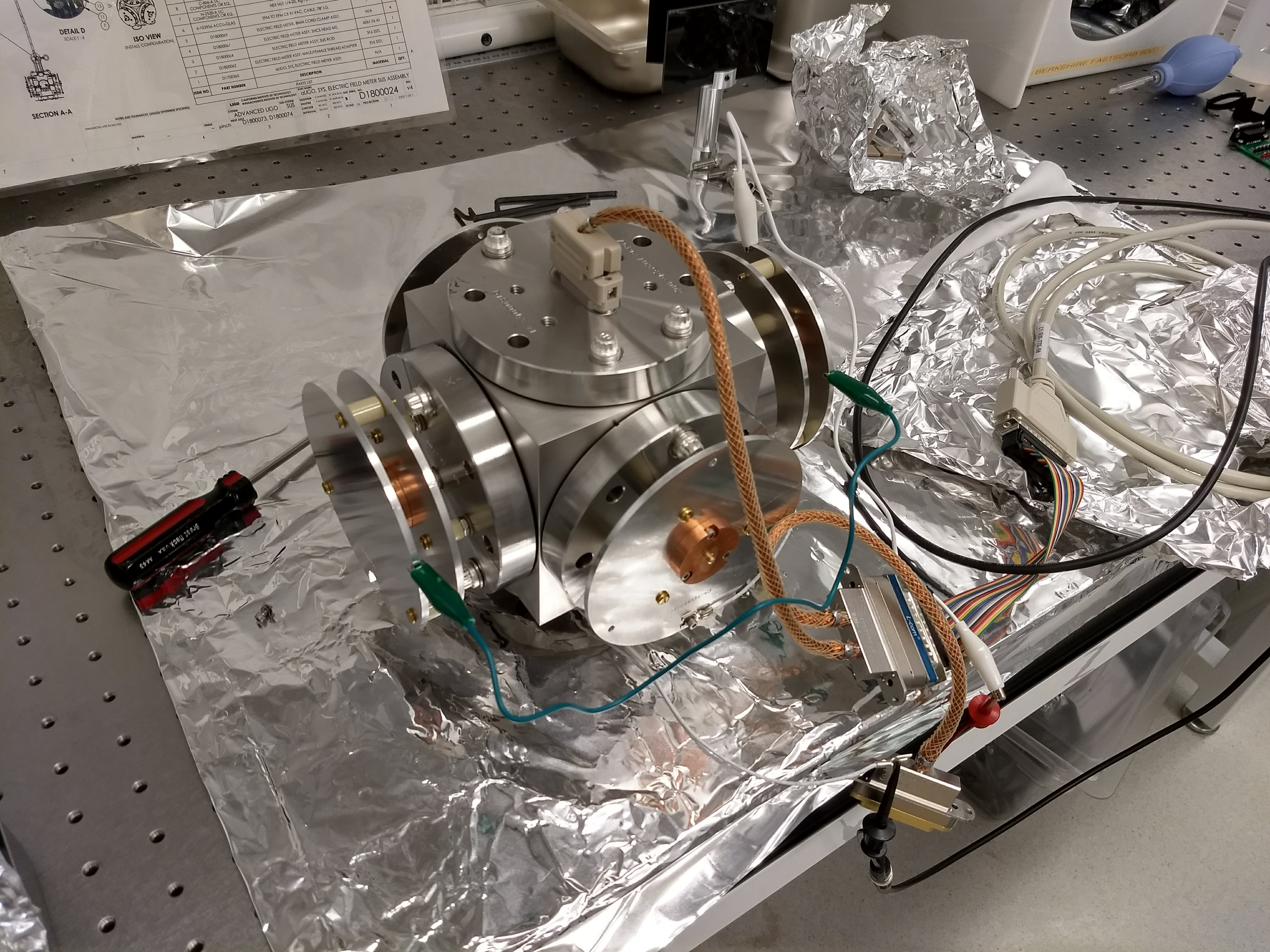 We have begun testing and characterising the electric field meter (EFM) brought over from Caltech. The first photo shows the EFM with the sensing plates shorted. All of this activity took place in the optics lab.