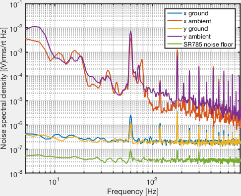 We used the SR785 to take noise spectra with the plates grounded, and of the ambient electric field (or acoustic environmental noise) for the X and Y plates. These spectra are shown in the first plot, the y data have 25 averages while the X data has one. The grounded spectra are in agreement (the 60 Hz harmonics are present in the blue x trace also) which makes sense, however I’m not sure why there is a significant difference between the x and y ambient spectra.