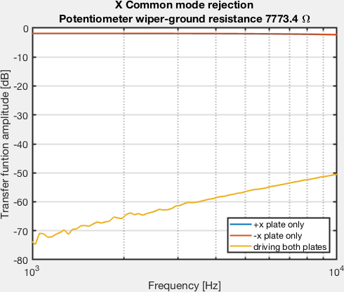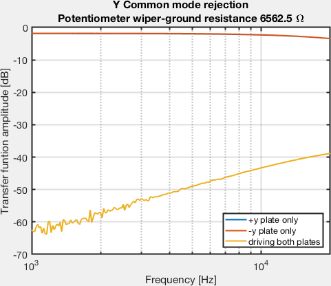 We then tuned the digital potentiometers, using the Arduino and Luis' code, to optimise the common mode rejection between the X+ and X- plates and the Y+ and Y- plates. To do this we attached the calibration plates over the sensor plates (but electrically isolated), and drove the common mode with a 1V signal. This configuration is shown in the second photo. The transfer functions to the common mode, and to a single plate, are attached for the Y plates. (the X data did not save properly and we did not have time to go back and get it. If I remember correctly we had ~47 dB of common mode rejection on the X plates, but please correct me if this is wrong). We achieved roughly 60 dB of common mode rejection between the y plates at 1 kHz, though this gets worse at higher frequencies.