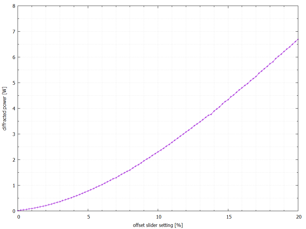 The diffracted power versus MEDM offset slider setting was measured (see attached plot). The output power from the neoVAN amplifier was measured to be 79.25 +/- 0.05 W. We will need this when the first loop power stabilisation comes back on line. Ed / Peter