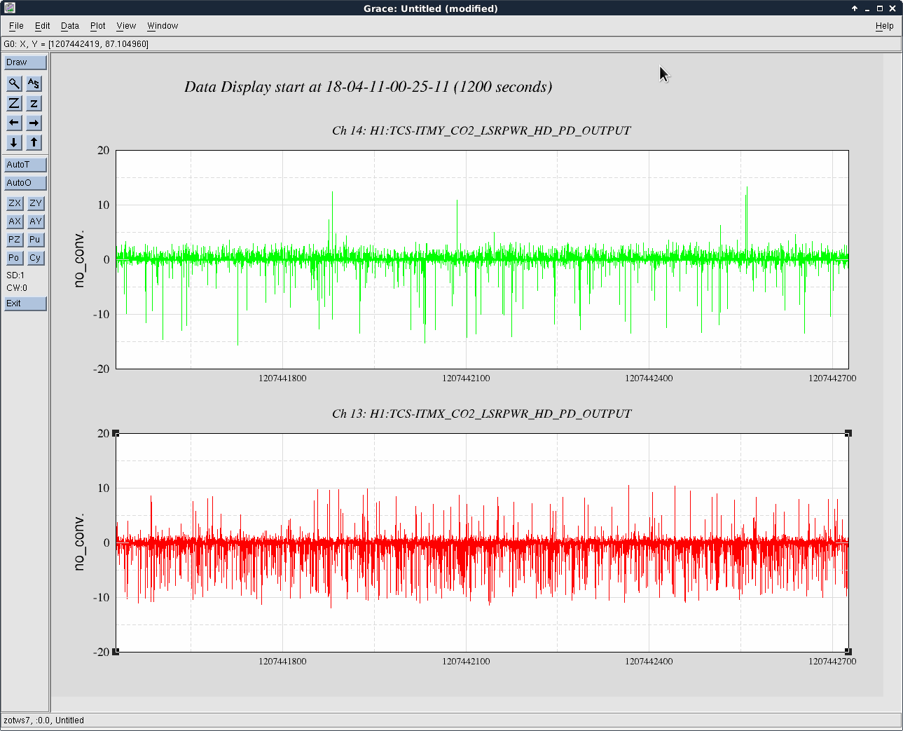 Cheryl, TVO, Daniel The TCSX and TCSY CO2 laser verbal alarms were triggered even though they were off because the controller box was powered down causing the flowmeter readback to reach negative values. Both controller boxes were turned on and the flowrate reached nominal values but verbal alarms still persisted. To silence verbal alarms we raised the alarm condition of the CO2 laser powerhead PD from 5 watts to 10 watts. This cut out most of the alarms but the attached figure shows that the laser powerhead PD channels still glitch above the threshold.