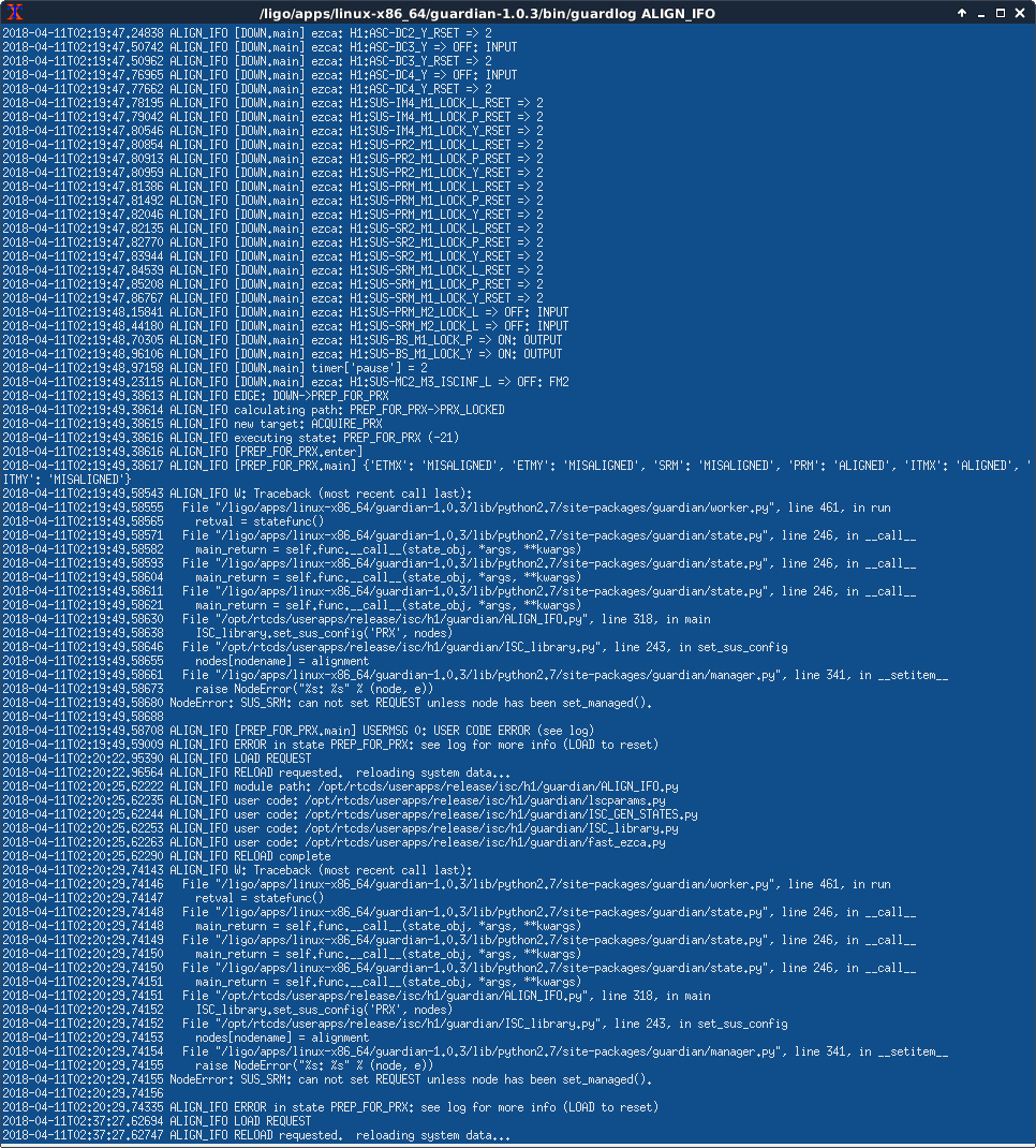 jameson.rollins@opsws12:~ 0$ ssh guardian@h1guardian1 status SUS_BS ● guardian@SUS_BS.service - Advanced LIGO Guardian service: SUS_BS Loaded: loaded (/usr/lib/systemd/user/guardian@.service; enabled; vendor preset: enabled) Drop-In: /home/guardian/.config/systemd/user/guardian@.service.d └─timeout.conf Active: active (running) since Sun 2018-04-08 14:48:47 PDT; 1h 53min ago Main PID: 24724 (guardian SUS_BS) CGroup: /user.slice/user-1010.slice/user@1010.service/guardian.slice/guardian@SUS_BS.service ├─24724 guardian SUS_BS /opt/rtcds/userapps/release/sus/common/guardian/SUS_BS.py └─24745 guardian-worker SUS_BS /opt/rtcds/userapps/release/sus/common/guardian/SUS_BS.py Apr 08 14:48:50 h1guardian1 guardian[24724]: SUS_BS executing state: ALIGNED (100) Apr 08 14:48:50 h1guardian1 guardian[24724]: SUS_BS [ALIGNED.enter] Apr 08 16:01:45 h1guardian1 guardian[24724]: SUS_BS REQUEST: ALIGNED Apr 08 16:01:45 h1guardian1 guardian[24724]: SUS_BS calculating path: ALIGNED->ALIGNED Apr 08 16:01:45 h1guardian1 guardian[24724]: SUS_BS same state request redirect Apr 08 16:01:45 h1guardian1 guardian[24724]: SUS_BS REDIRECT requested, timeout in 1.000 seconds Apr 08 16:01:45 h1guardian1 guardian[24724]: SUS_BS REDIRECT caught Apr 08 16:01:45 h1guardian1 guardian[24724]: SUS_BS [ALIGNED.redirect] Apr 08 16:01:45 h1guardian1 guardian[24724]: SUS_BS executing state: ALIGNED (100) Apr 08 16:01:45 h1guardian1 guardian[24724]: SUS_BS [ALIGNED.enter] jameson.rollins@opsws12:~ 0$