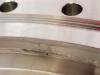 Then the baffle housing was visually inspected (SN#001), right away Mark found the hole on one of the welds, see photo, Bubba, Tyler and I confirmed the spot, something to note are the stains on the metal due to the isopropanol alcohol, which was sprayed on the exterior of the chevron baffle housing and sipped towards the inside of the housing. We sprayed alcohol trying to determine the location of the leak.