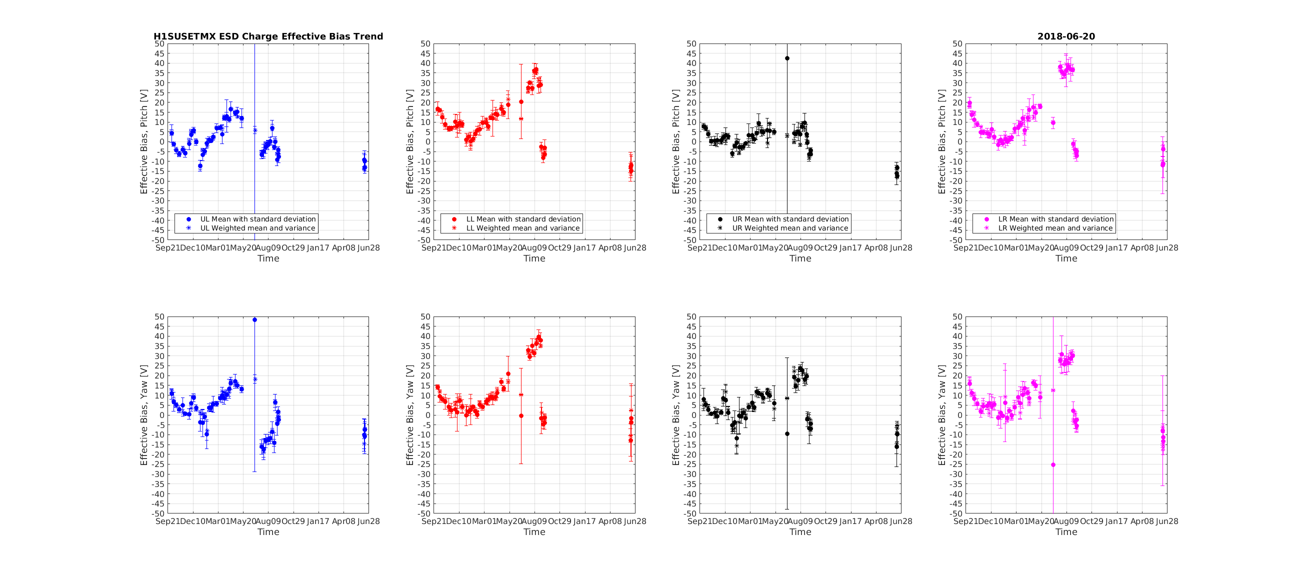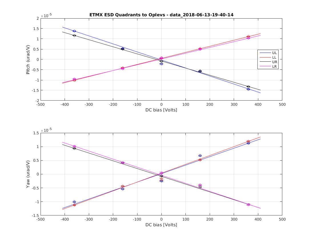 To check the results from my ETMX electrostatic co-efficient measurements (alog 42572) I ran the usual optical lever V_eff measurements. The results show roughly 0 to -20V on all quadrants, which is the same ballpark as I measured earlier this week.