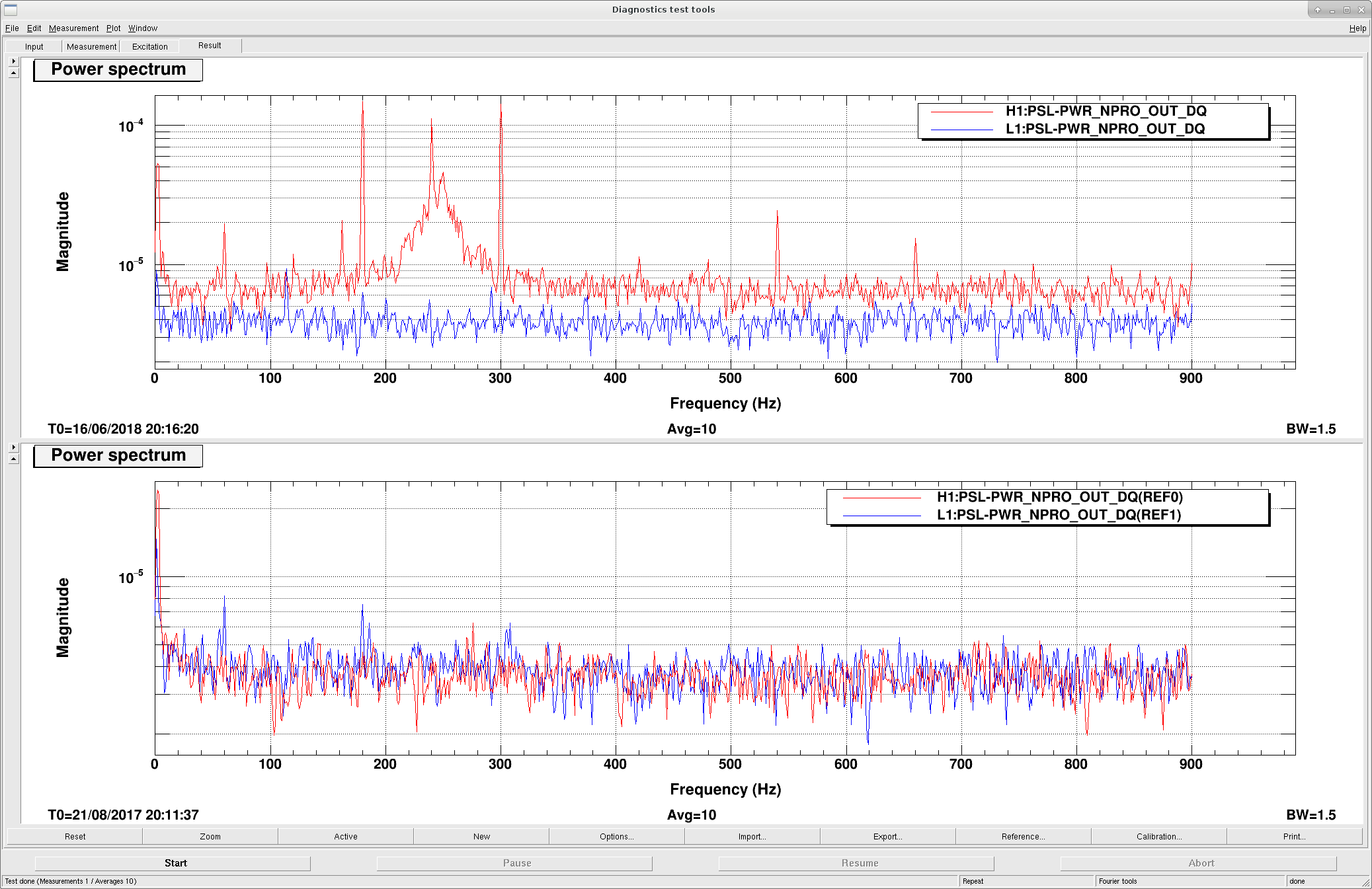 Just out of curiosity, I looked at the equivalent channels at LLO since I'm here. They don't see this noise symptom. In both panels, red is H1 and blue is L1. Top panel is a few days ago (so I could use NDS2), bottom panel is last August before the 70W amplifier install. The NPRO wasn't changed, so it's certainly curious that we have this new feature. My mistake. We do have a new NPRO.