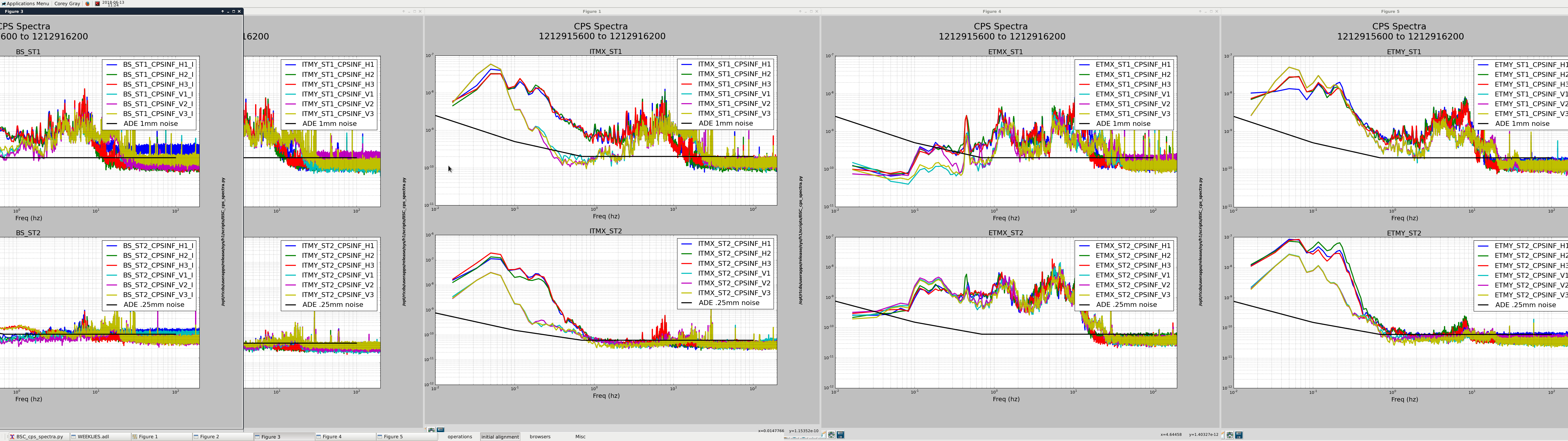 Attached are spectra from these three periods, the platform was damped during these times. The top plot is the current nominal state showing the extreme noise on the corner3 sensors. In the middle plot, the H3 sensor is unplugged and the V3 sensor nicely trends with the other vertical channels. The bottom plot is during the time V3 is unplugged and the H3 signal mostly trends sort of with the other horizontal signals. In both unplugged tests, the remaining corner3 signal still shows higher noise at higher frequencies maybe hinting at the underlying issue.