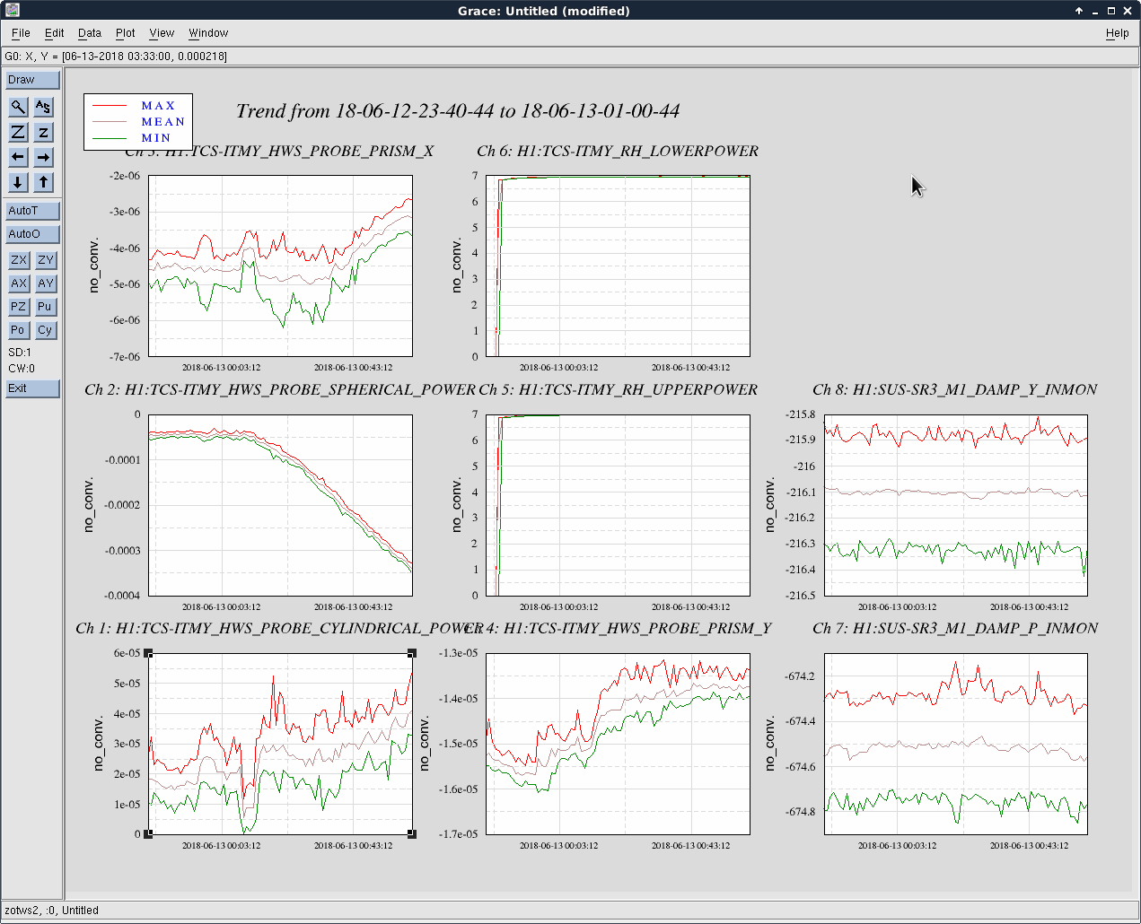 J. Kissel Overheard the alarm that TMSX's independent software watchdog (SWWD) tripped at Jun 14 2018, 00:06:27 UTC. Control room reports not activity. Don't know why. Regular watchdog did not trip. Transverse DOF was SUPER rung up. ISI was still isolated, showed some red in its ST2 performance matrix in RZ, but may have been reactionary. To fix: Bypassed the SWWD. Tried just turning on all damping loops by hand at their regular gains. Saw that Transverse had obviously huge control output request. Tried slowly (well, just one-at-a-time) turning on each degree of freedom besides T with normal gain. Works. Waited for a bit, still obviously large transverse motion (looking at speed dials). Turned on Transverse with much-less than normal gain (normal = -3. Started with -0.1.). Works. Slowly (increments of factors of two, every 20-30 seconds, watching the speed dials) turned up the gain back to normal. Now looks OK. QUAD looks OK. Don't have time to figure out what happened...