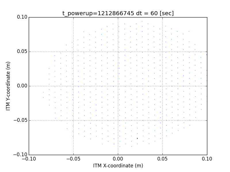 After we aligned HWS ITMY and felt we were close to the conjugate plane of the test mass, we started the HWS acquisition code and took new references. In order to fine tune the alignment, we also turned on the ring heater at 2 Watts (1 on the bottom, 1 on the top) and looked at the spherical power as well as the prism_x and prism_y values. As shown by the animation, it looks very badly misaligned but we found that this was due to a drift in SR3 when we were taking measurements and this threw off our results.