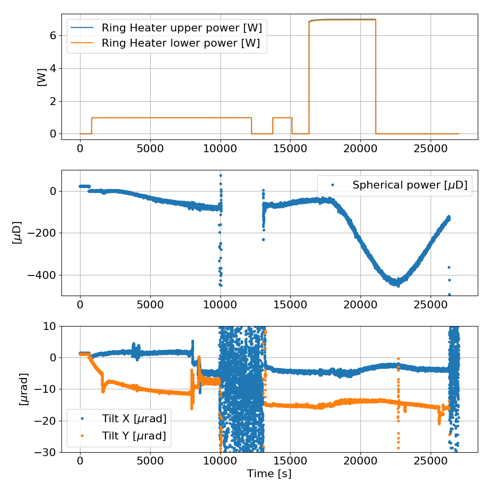 A few hours later we decided to energize the ring heater with higher power (7 Watts on the bottom, 7 on the top) and made sure that SR3 was not drifting too much, we saw a ratio of the Prisms_X/Y and Spherical_Power drop to about 5mm. The animation below shows that the heating pattern is much more centralized on the heater, but this is with a bad reference prior to the SR3 drift mentioned above so it still has residual heating imbalance. When we get a chance, we can try to get a good reference and redo this scan overnight. Because the heating causes changes in alignment, it might not be compatible with other commissioning tasks (alignment, locking, etc)
