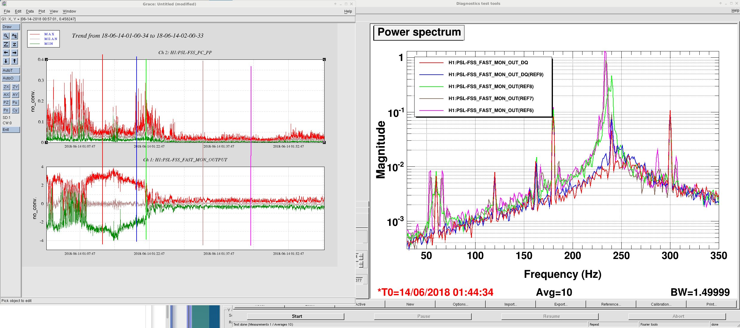 Attached is FSS FAST_MON_OUT spectrum taken at different times over ~30 minutes with the same FSS and IMC settings. From the oldest (pink) to the newest (red) trace, the oscillation changed from terrible to good-ish.