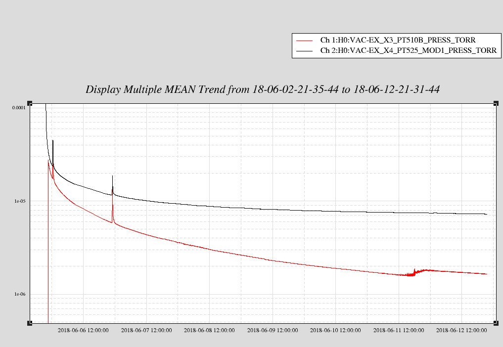 EX pump down curve attached. There is a strange feature in the curve from Monday morning that caused the pressure read back to change, but not evident in the adjacent hot cathode gauge, so it could be an electronics issue specific to this cold cathode gauge.