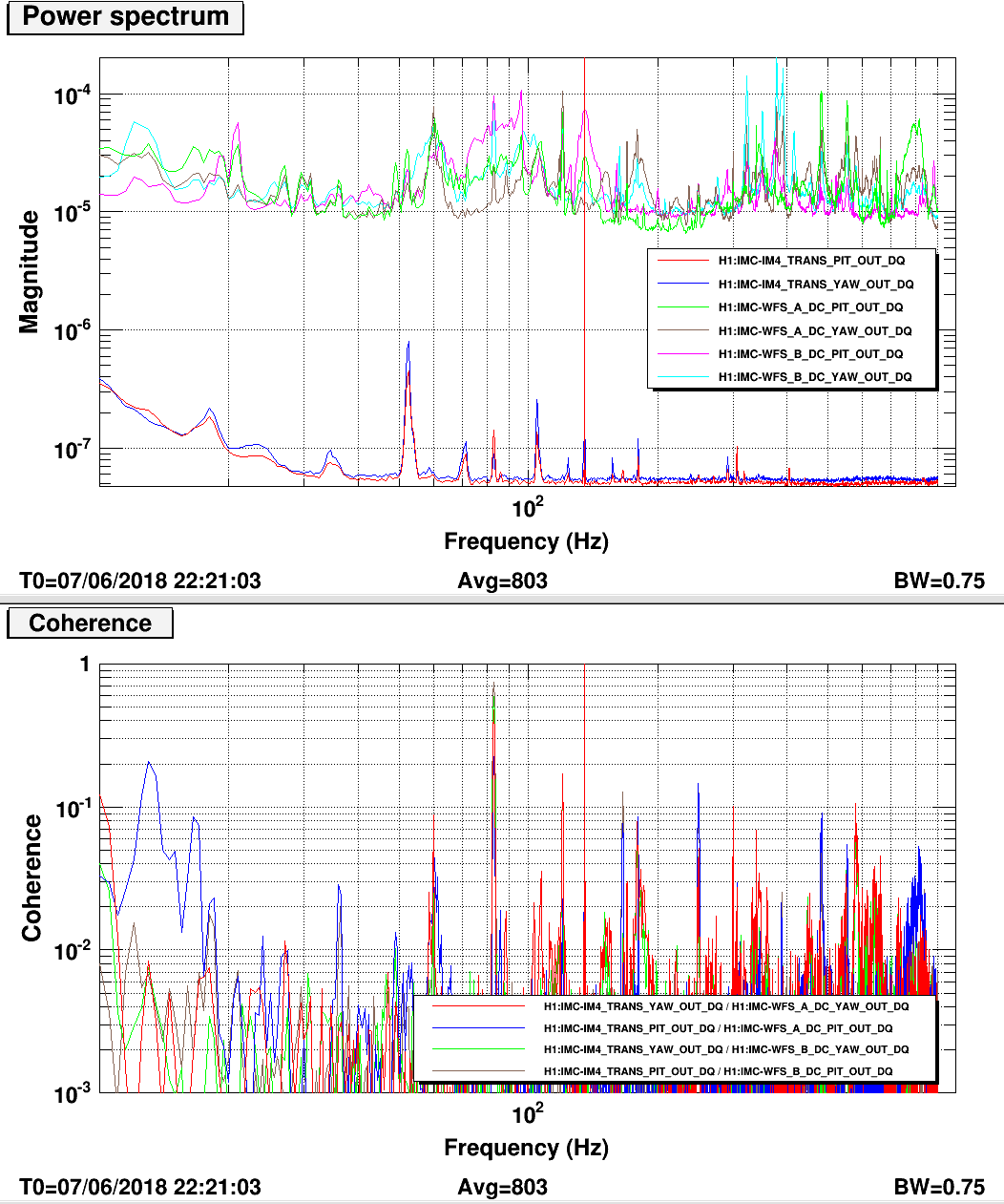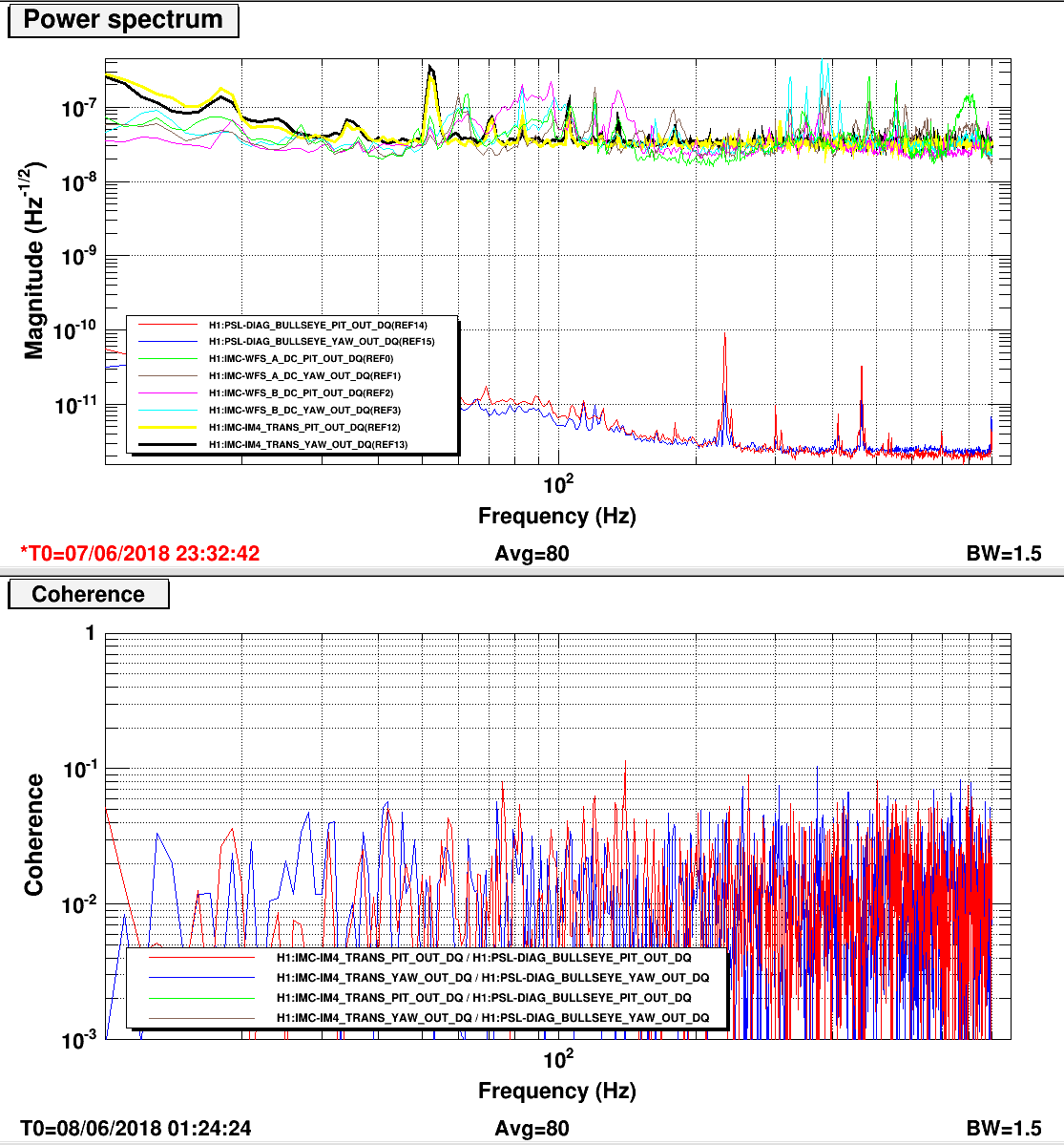 We then compared the PSD at the bullseye with the IMC-WFS (on reflection, measured with IMC unlocked) and IMC-IM4_TRANS (with IMC locked) to look for jitter coupling.