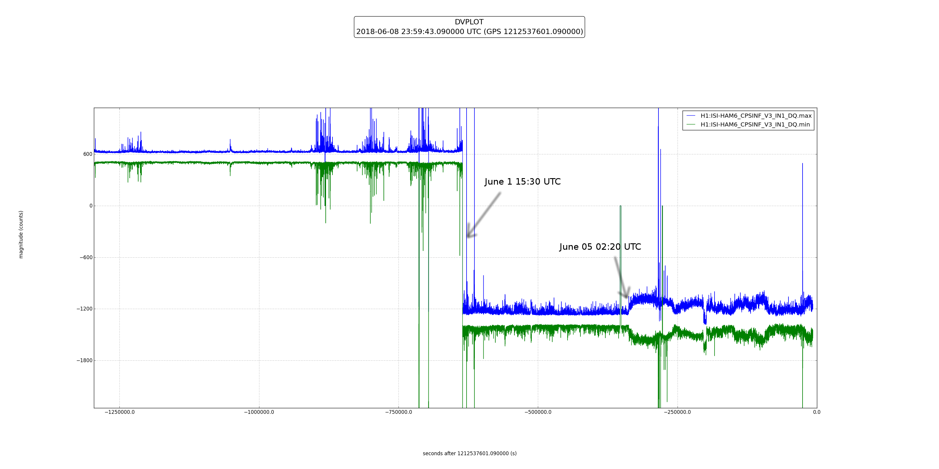 The DC level changed on June 1st at 15:30 UTC (08:30 am local), and the noise went up starting June 5 at around 02:20 UTC (19:20 local), see second plot.
