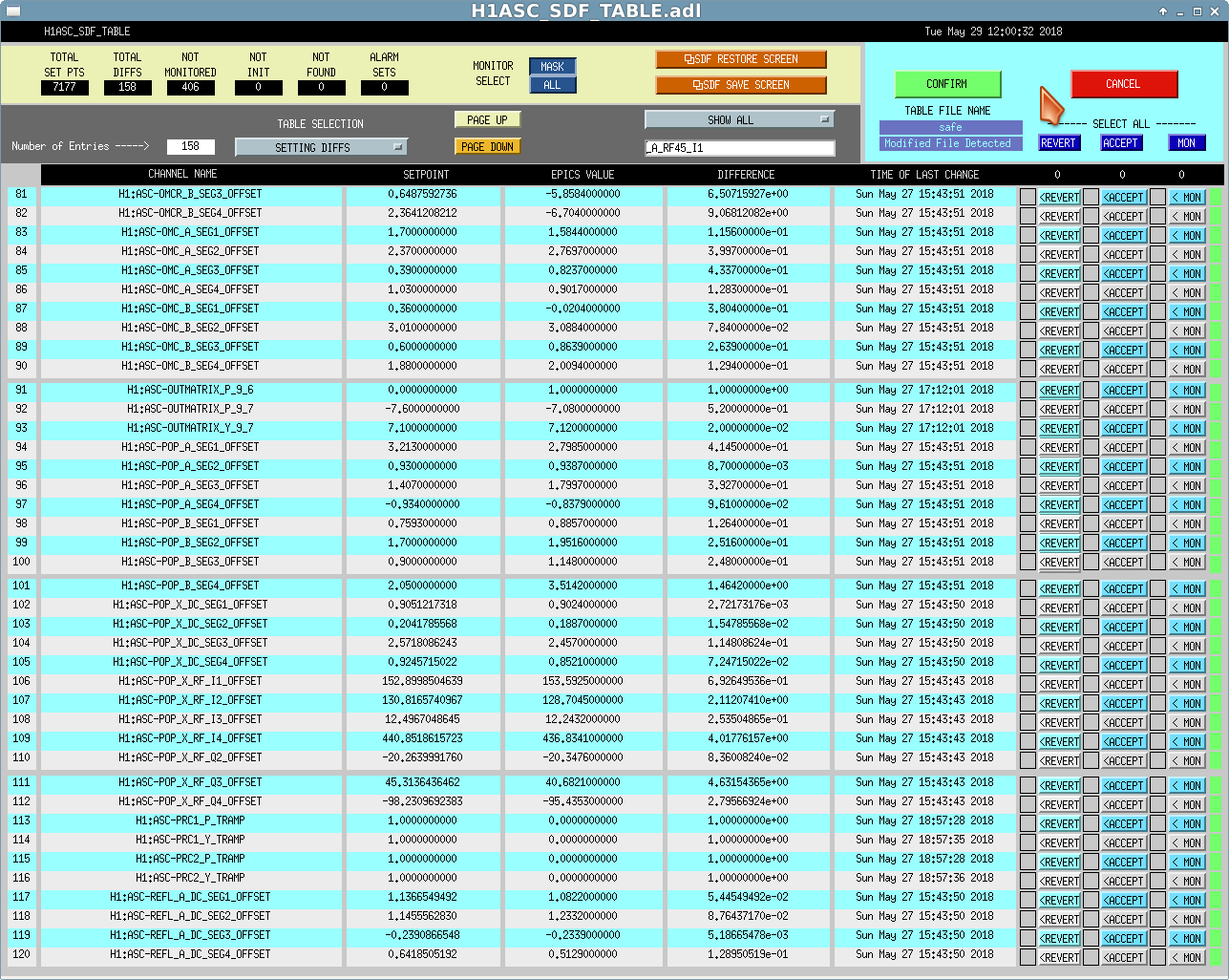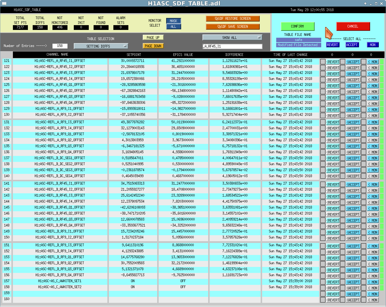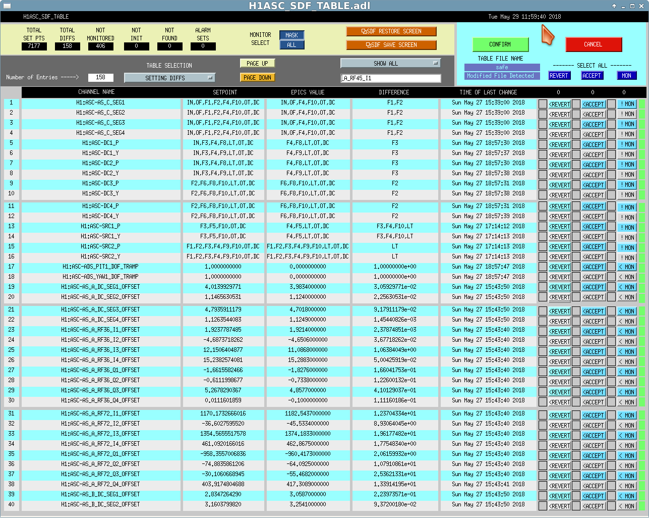 New h1asc model was installed. 522 RF72 slow channels were removed from the DAQ-INI. Prior to the restart the SDF was reporting 158 diffs, these are shown in the attached images.