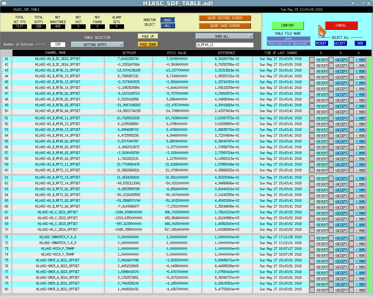 For the SDF of AS_A: In order for the AS_A_RF45 WFS to run faster than 2k (the rate of the regular ASC model) for use with locking without dealing with the IOP model, we have put AS_A_RF45 into the ASCIMC model (which runs at 16k). This means that AS_A_RF45 SDF settings should be accepted into the ASCIMC SDF.
