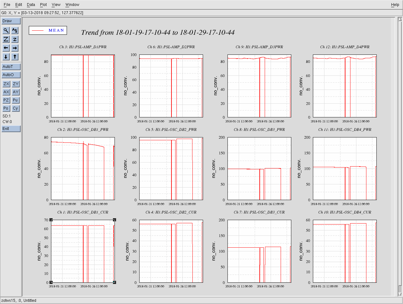 Came in this morning to find the oscillator off. The front end was still running. Looks like the watchdog kicked in some ime around 5:30 pm Saturday. The power decay from head 1 is the reason for the decay in laser output power. I upped the current of the 3 other diode boxes by 0.5 A. Laser restarted without any major hiccups. Other stuff came on-line pretty quickly. Witnessed a couple of occasions where the injection locking was lost.