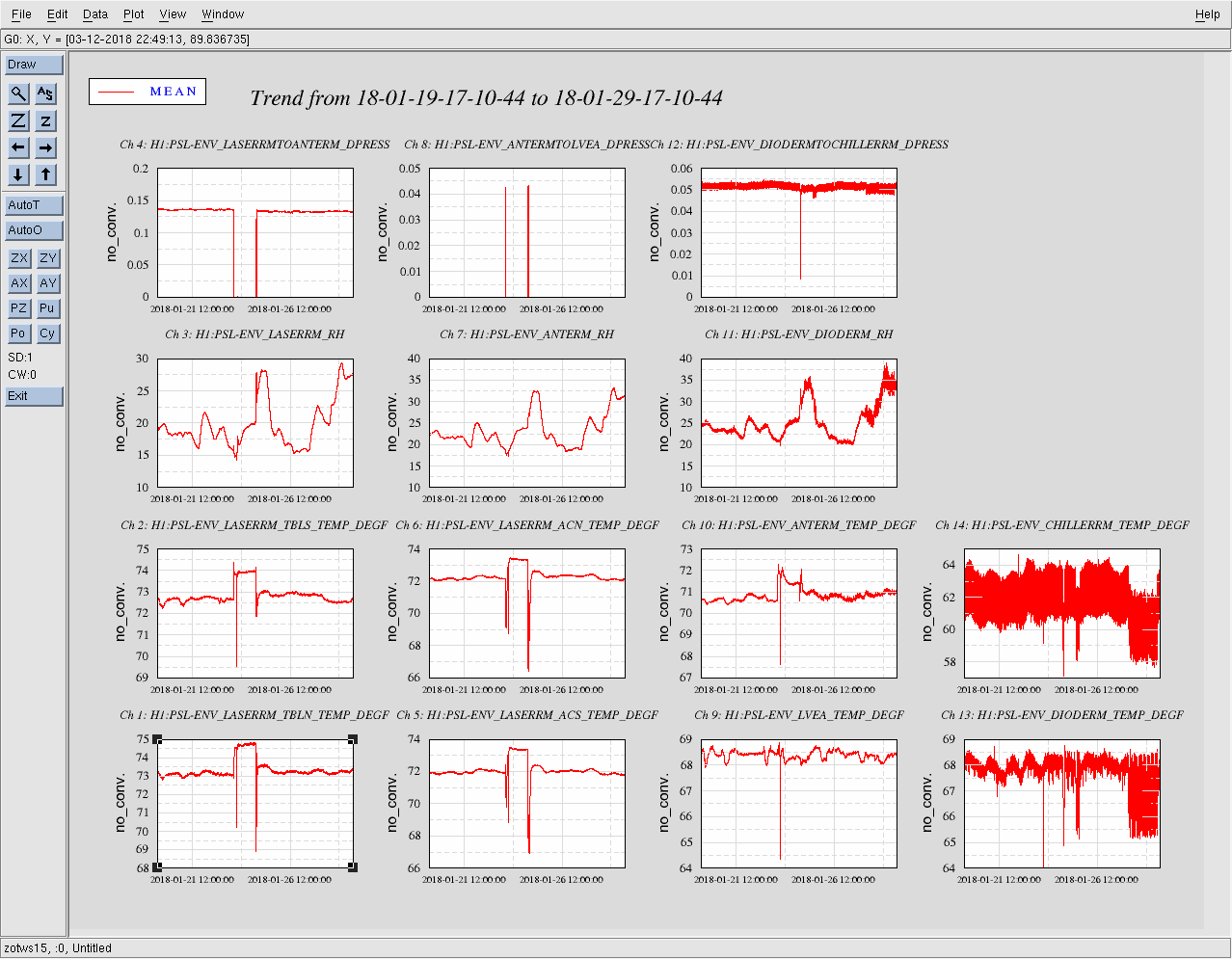 Laser Status: SysStat is good Front End Power is 35.24W (should be around 30 W) HPO Output Power is 140.2W Front End Watch is GREEN HPO Watch is GREEN PMC: It has been locked 0 days, 3 hr 16 minutes (should be days/weeks) Reflected power = 23.22Watts Transmitted power = 41.32Watts PowerSum = 64.54Watts. FSS: It has been locked for 0 days 3 hr and 16 min (should be days/weeks) TPD[V] = 1.968V (min 0.9V) ISS: The diffracted power is around 3.9% (should be 3-5%) Last saturation event was 0 days 3 hours and 12 minutes ago (should be days/weeks) Possible Issues: PMC reflected power is high