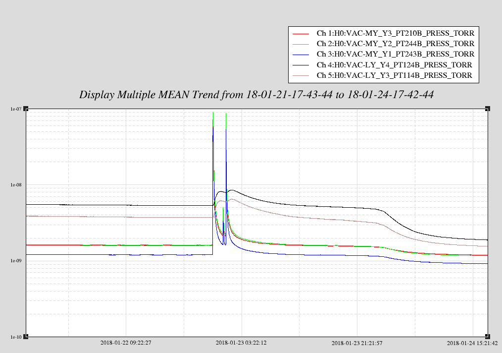 Y1 beam tube pressure improved after spinning up mid-Y main turbo pump (with its GV closed). Before starting turbo, the turbo inlet pressure read ~ 1 Torr, so its GV leaks. We have new valves on order, but vendor keeps delaying delivery. Hope to replace this valve in early Feb.