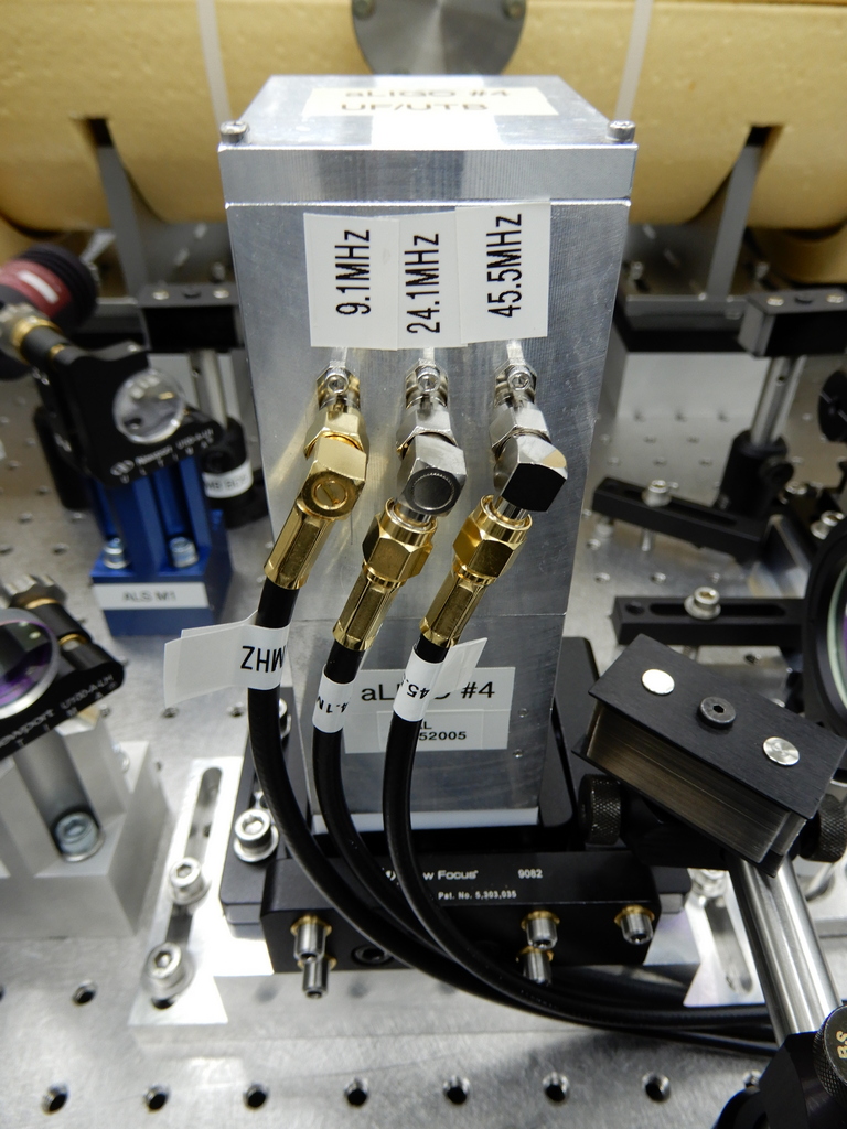 Checked on the RF connections to/from the EOM. I could not get an SMA torque wrench around the middle (ie the 24.1 MHz) connector because there was insufficient space. The two outer connectors (9.1 and 45.5 MHz) and the two cable connectors (24.1 and 45.5 MHz) checked out okay. The other end of the cables is an N connector. One difference between the cables is that the 9.1 MHz cable has no 90 degree SMA elbow connecting it to the EOM body.