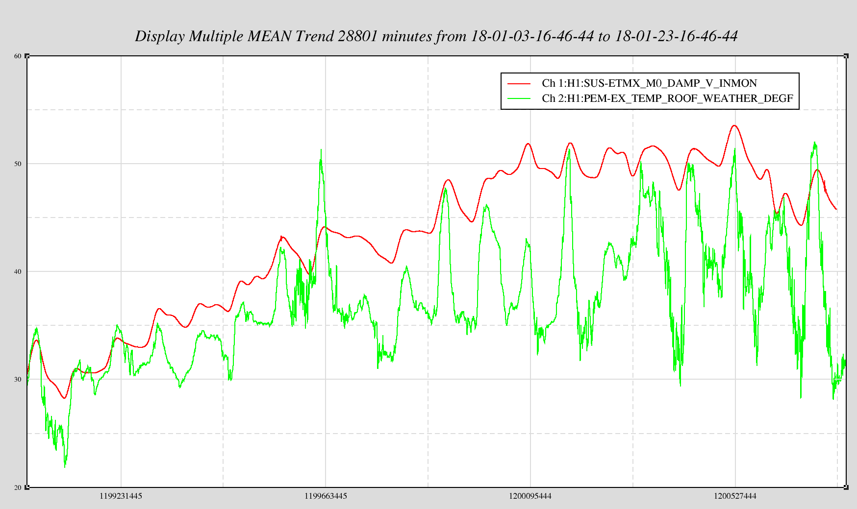 The first attached plot shows twenty days of the ETMX M0 Vertical and the EndX OAT. The M0_V has been shifted -20000 seconds where it shows a nice correlation with the daily temperature cycles as well as the longer term trend.