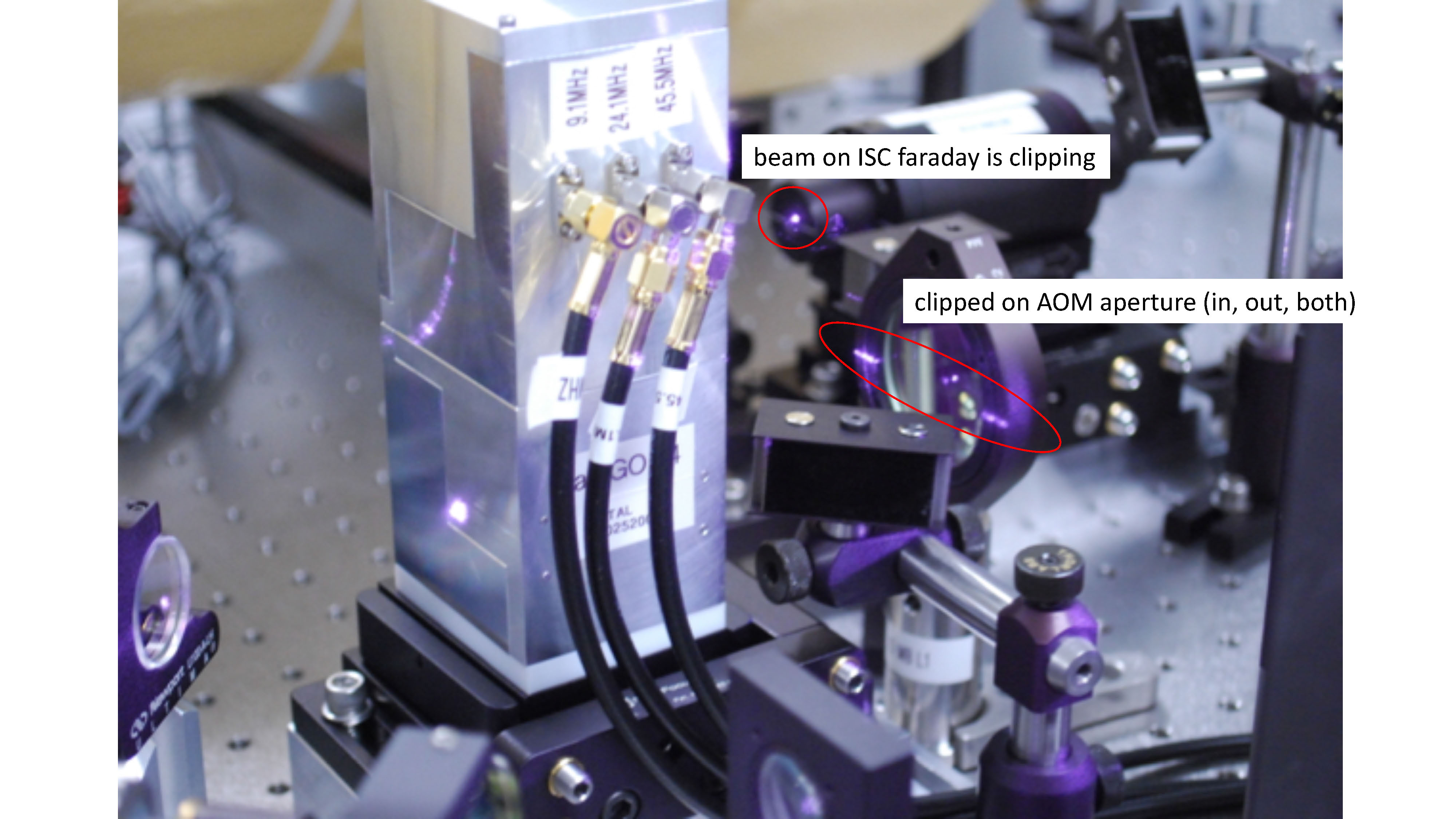 Beam on EOM input steering mirror has moved enough that a beam that should go through is clipped on the left side of the steering mirror.