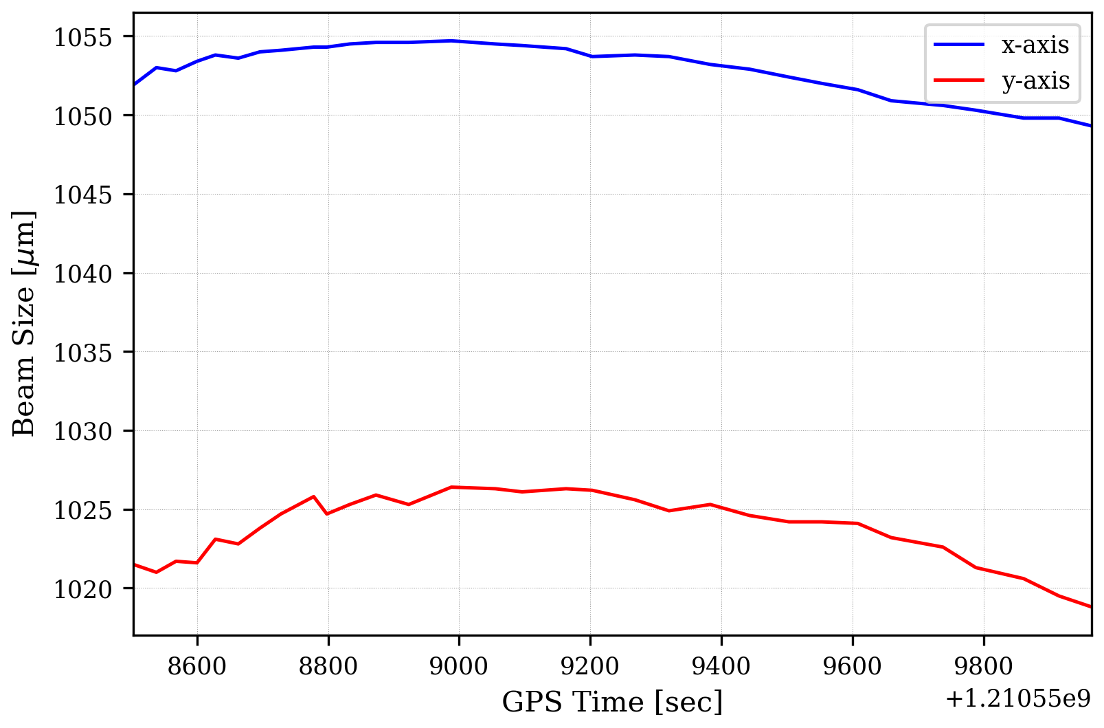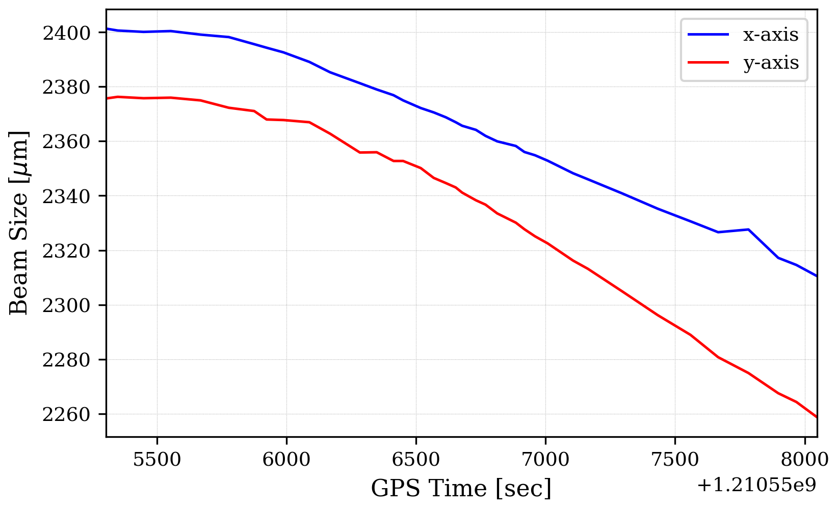 The starting beam size was (2401.2, 2375.6) um and the final size was (2310.5, 2258.7) um.
