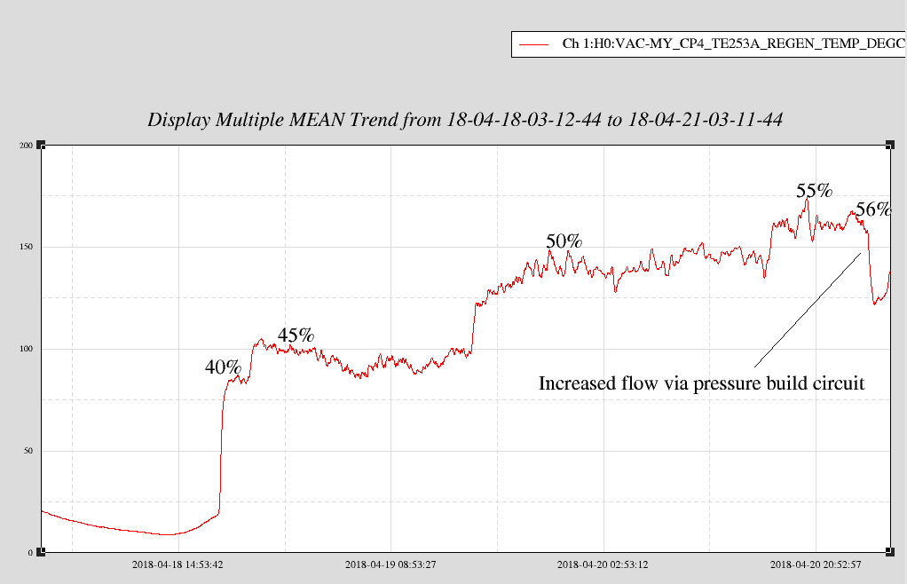 As found, GN2 flow through CP4's regeneration circuit was steady and indicated on the first scale graduation (12 SCFH x 100). The dewar head pressure(s) were 10 psi and 12 psi as per the mechanical gauges -> I opened the Pressure Build valve 1 turn ccw and the dewar head pressure increased by 2 psi over 20 minutes. Correspondingly, the GN2 regeneration flow increased to a varying 40 - 50 SCFH x 100. I did not notice any reverse flow through the Fill Connection line. The Regeneration Temperature decreased, as expected, with the increase in flow. Even so, I don't feel comfortable leaving the site with the Pressure Build valve open as we have no way to remotely monitor the exhaust line pressure and I can't be sure that the dewar head pressure has stabilized. As a compromise, I closed the Pressure Build valve and, instead, adjusted the dewar head pressure (a.k.a. vapor pressure) regulator (a.k.a. "economizer") 1/4 turn cw. This should slowly increase the dewar head pressure a little over the next day or so and the regeneration flow should also increase a little as a result.