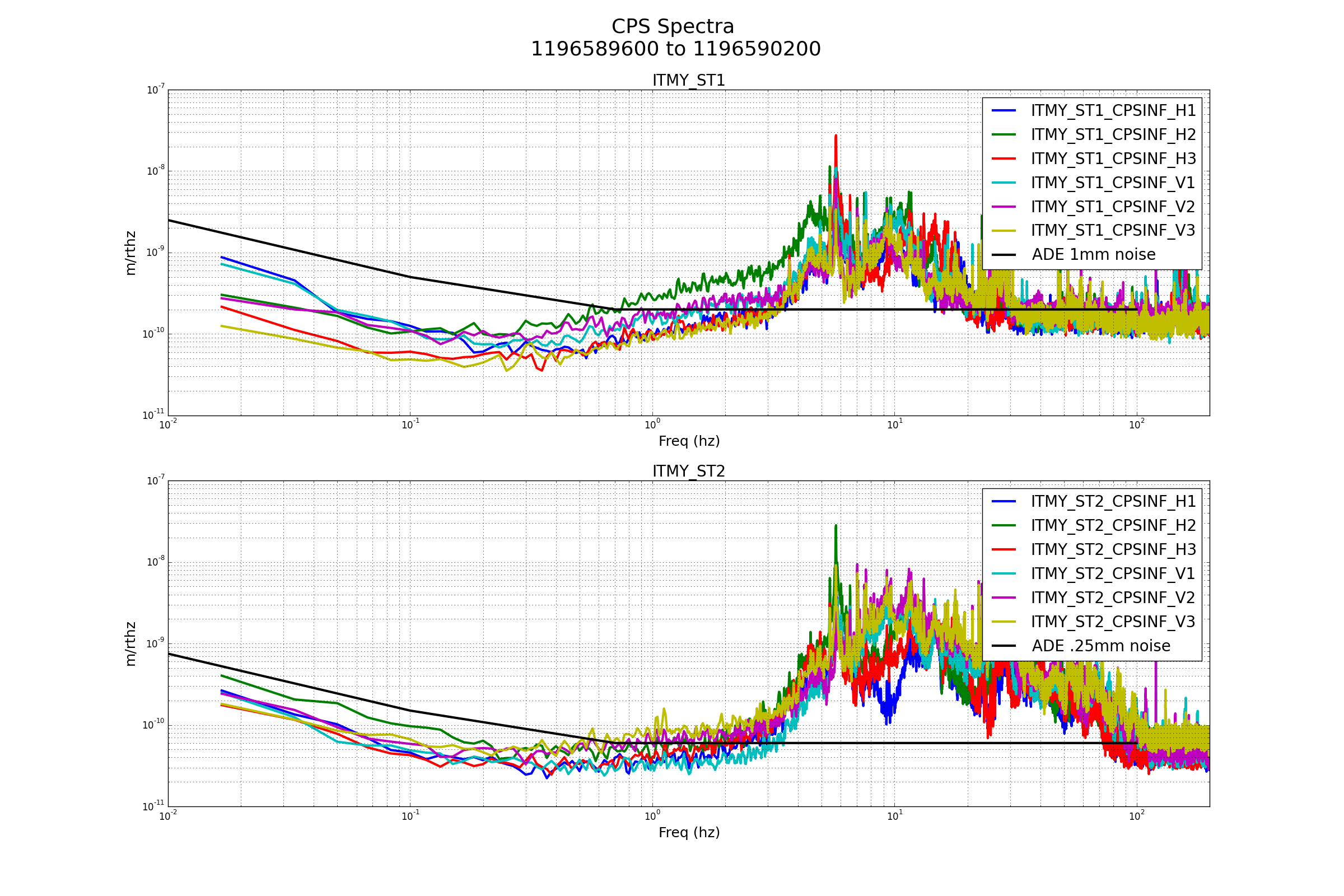 I took some quick dtt tfs on ITMX today, because some of the long matlab tf infrastructure isn't working right now. I only took ST1 X,Y,Z,RX, &RY (I don't know what RZ would tell me better than the other dofs) tfs and looked at ST1-ST1 and ST1-ST2 tfs, I think this gives me enough data to compare to past tfs. First 2 plots are the ST1act to ST1l4 & ST1act to ST2gs13. Second two plots are the cartesian undamped tfs (for the same actuators and sensors) that we used to design the controllers on ITMX. I think they are in the same units, they look similar enough I think we can say ITMX ISI is free.