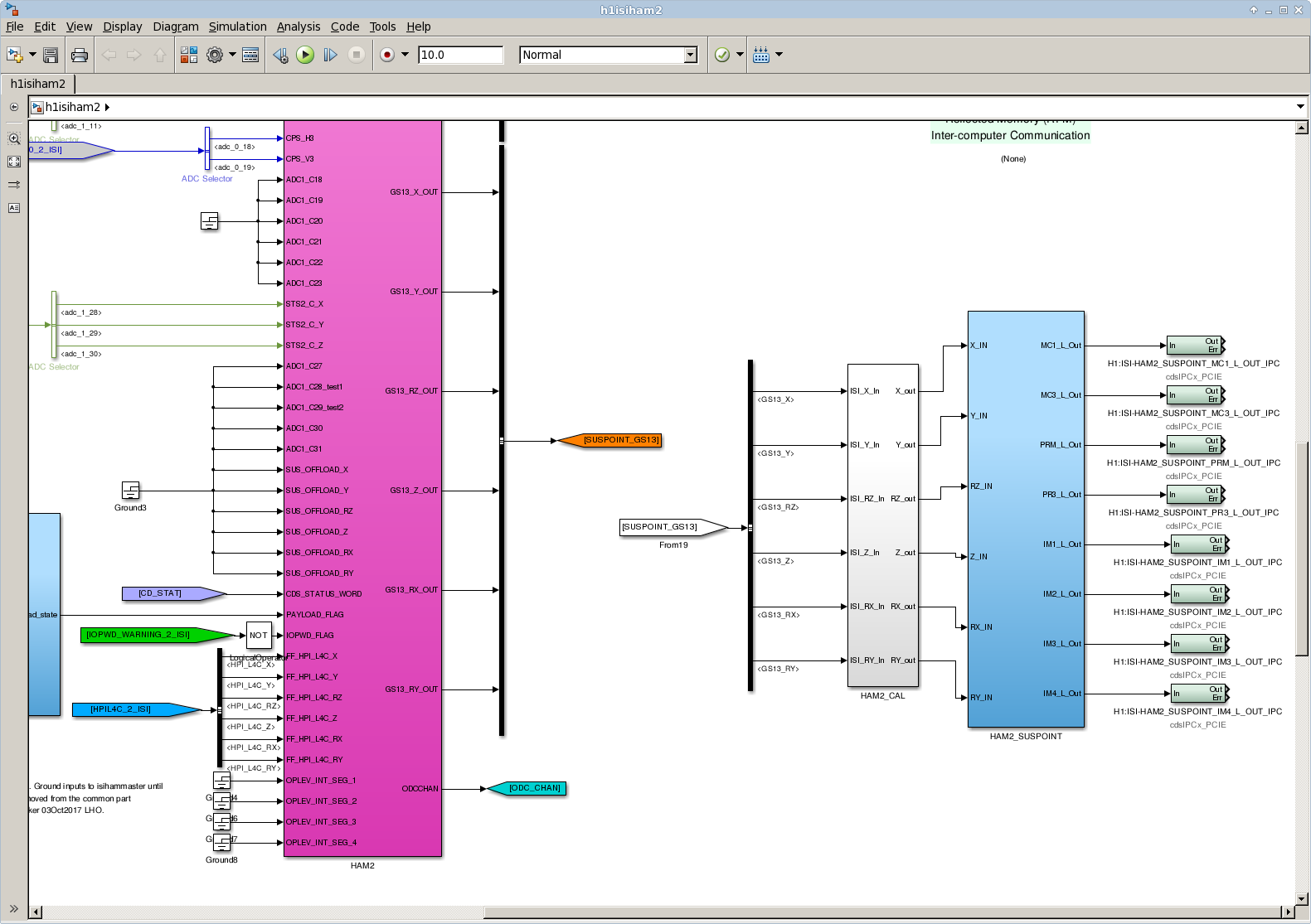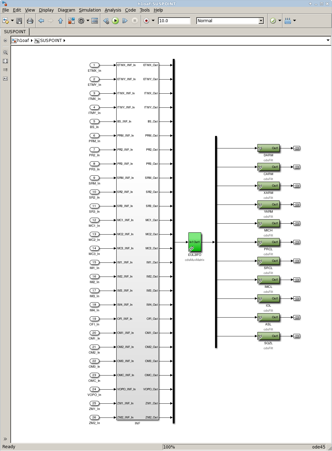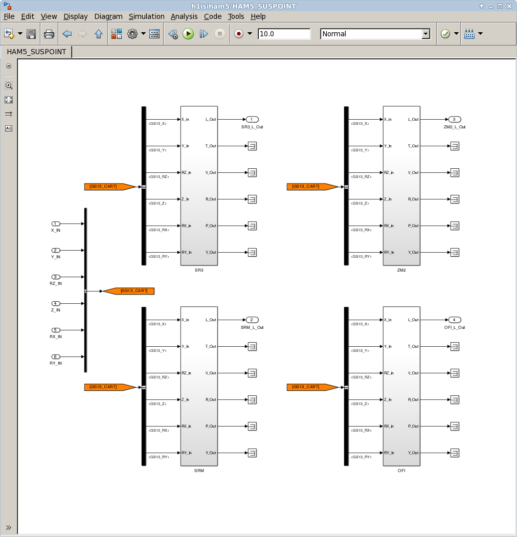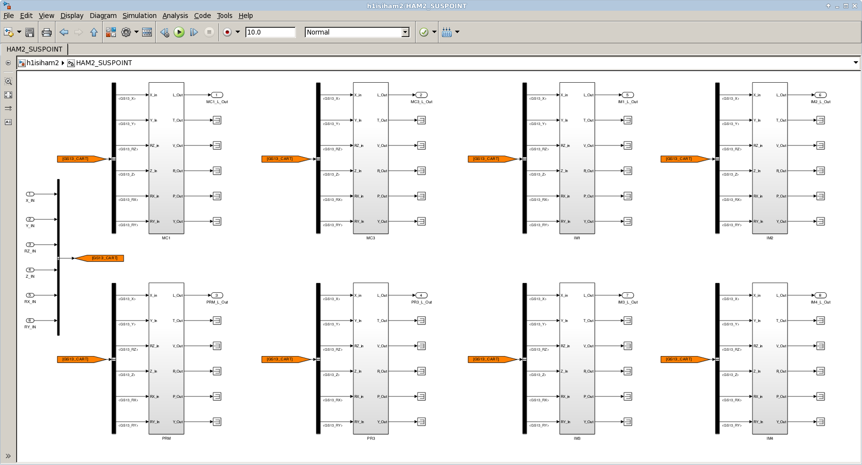 J. Kissel, D. Barker Now that we've moved the suspension point projections into the ISIs (e.g. LHO aLOG 26363), it's much easier to add new interesting suspension point projections to each platform. I've added new projection infrastructure to ISI HAM2, ISI HAM5, and ISI HAM6 to include - ISI HAM2: Connecting the pre-existing IM1, IM2, IM3, and IM4 projections' longitudinal output via dolphin IPC destined to be picked up by h1oaf.mdl. - ISI HAM5: Creating new SUSPOINT projections for the OFI and ZM2 with associated new senders via dolphin IPC to the h1oaf.mdl. The new projections are stored in the frames at 4096 Hz. - ISI HAM6: Creating new SUSPOINT projections for VOPO and ZM1 with associated new dolphin IPC senders to the h1oaf. The new projections are stored in the frames at 4096 Hz. Also, creating new dolphin IPC sensors for the pre-existing longitudinal output for the OMC, and OM1, OM2, and OM3. - OAF: In OAF, all corresponding new and newly added longitudinal suspension point projections were added as inputs to the giant cavity basis matrix, with new output elements, - "IOL" for "Input Optics Length," imagined* to be the coherent sum of IMs L, to recreate path length displacement between the IMC output and PRM IFO input - "ASL" for "Anti-Symmetric Length," imagined* to be the coherent sum of the OFI, the OMs, and the OMC, to re-create path-length displacement between the SRM IFO output and the OMC - "SQZL" for "SQueeZe Length," imagined* to be the coherent sum of the VOPO and the ZMs to recreate the squeezer path length displacement between the VOPO and the OFI *I say "imagined to be" because that's what I naively think should go into the coherent sum to recreate the path length, but the matrix has been setup that it can be the coherent sum of any optic, if we so chose later. Attached are screenshots of the relevant parts in each model that were affected by this change. We'll make the modifications to each HAM ISI's custom SUSPOINT screen in due time. We don't yet have projections for any of these new suspensions (or from the OMs), but I'll eventually work with the systems group to get something good enough. Finally, of note, I've *removed* the last of the suspension point projection displays from the OM ALL and RM ALL MEDM screens, as has been done some moons ago for all other SUSs.