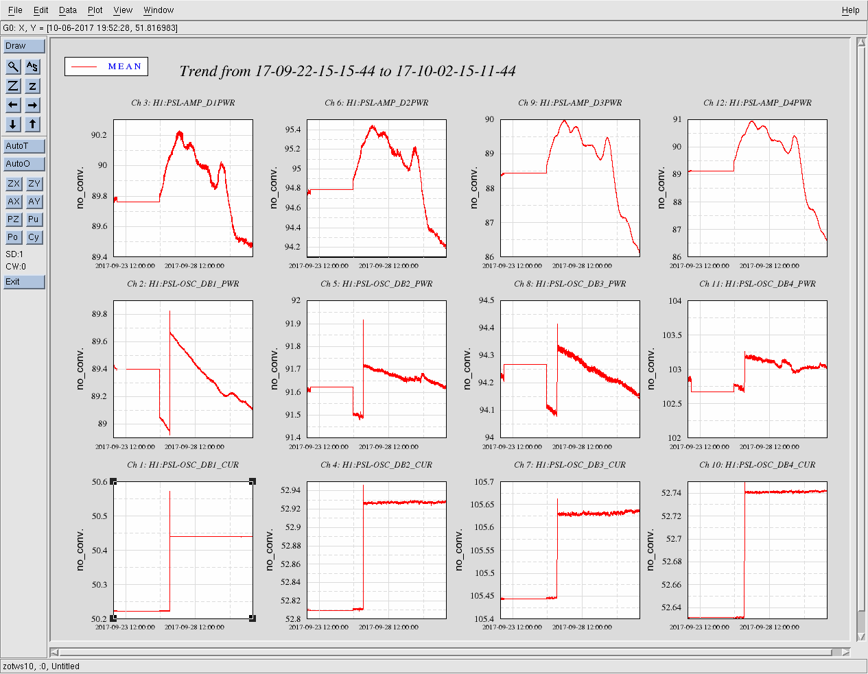 TITLE: 09/29 Partial Day Shift: 17:30-23:00 UTC (08:00-16:00 PST), all times posted in UTC STATE of H1: Planned Engineering LOG: Covered from 17:30 - 23:00 UTC 17:56 UTC Corey out. Keita can transition LVEA to laser hazard. 17:59 UTC Ed out. 18:09 UTC Keita done transitioning LVEA to laser hazard. 18:32 UTC Alastair starting run along X arm. 19:07 UTC Greg G. to LVEA. 19:20 UTC Cheryl, Keita, Ed, Corey: align beam in PSL enclosure to HAM2 and IO work on HAM2 and HAM3. 20:36 UTC Travis to HAM5 and HAM6 area. Rearrange cleanrooms. Radius of curvature actuator. Not in chamber. 21:28 UTC Travis done. 22:10 UTC Filiberto and Peter to mid Y to pick up power supply. 22:22 UTC Cheryl, Keita, Ed, Corey back to HAM3. 22:44 UTC Aidan to LVEA to check if the X arm CO2 thermal imaging camera is on. 22:50 UTC Aidan back. 22:59 UTC Kyle taking visitors around LVEA.