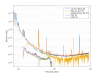 The last plot is meant to show that there is still a lot of noise from 30-60 Hz which was added at the time of the earthquake, which has a slope shallower than the 1/f^3 predicted for charge hopping but cannot be explained by the coupling to ISI motion.