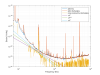 J. Kissel, T. Sadecki Attached are the results of the H1 SUS ITMX fiber characterization perform last week while the QUAD was (in-air) still fully suspended. After initially gathering data on the +X / +Y, Front Right (as viewed looking at the HR surface, a.k.a. the Angus Convention) without using a speaker array (see LHO aLOG 38743), we resumed the next day using the array, but with it not attached to the structure in any way, just resting on the chamber floor near the Left or Right side as needed. To complete Borja's table from LHO aLOG 38309, Angus Global Prev. Avg. This Conv. Coord. In-Air In-Vac Result FL -X/+Y 502.2+/-0.25 502.68 499.656+/-0.015 FR +X/+Y 500.8+/-0.25 501.15 500.797+/-0.015 BL -X/-Y 501.2+/-0.25 501.35 500.922+/-0.015 BR +X/-Y 499.9+/-0.25 500.13 502.219+/-0.015 Naturally, the confusing directions in which these change from in-air in in-vac makes me wonder whether the naming convention didn't get mix up somewhere along the way... However, with these measurements, we've taken up to the 6th harmonic in air. There are a select few of these results which are highly questionable, if not down-right untrustworthy. They're marked with an asterisk. However, all results are determined by just finding the maxmimum frequency bin in the spectra. Having starred at all the data by eye, this works, but because the Q of the mode is so large in air, I inflate the uncertainty to include two bin-widths, assuming that the mode is perfectly bin-centered (which isn't true). In other words -- take this data with grains of salt and a few flecks of black pepper. Here're those results in tabular form: FL(-X/+Y) FR(+X/+Y) BL(-X/-Y) BR(+X/-Y) Fund. 499.656 500.797 500.922 502.219 2nd 991.859 993.5781 996 995.2969 3rd 1455.5 1461.906 1461.891 1471.969* 4th 1923.953 1924.766 1923.594 1931.125 5th 2384.375 2396.813 2382.125 2460.813* 6th 2837.75 2845.063 2846.625 2830.813 Excitingly, at least in broad strokes, 3 of the 4 fibers show very similar in-harmonicity (and that which doesn't has the black pepper data points). I'm not sure how, but it would be very interesting to compare these higher harmonic results against the in-vacuum higher harmonics. Do we have individual fiber identification for non-fundamental harmonics? It's not reported in the LHO Violin Mode Table, for instance.