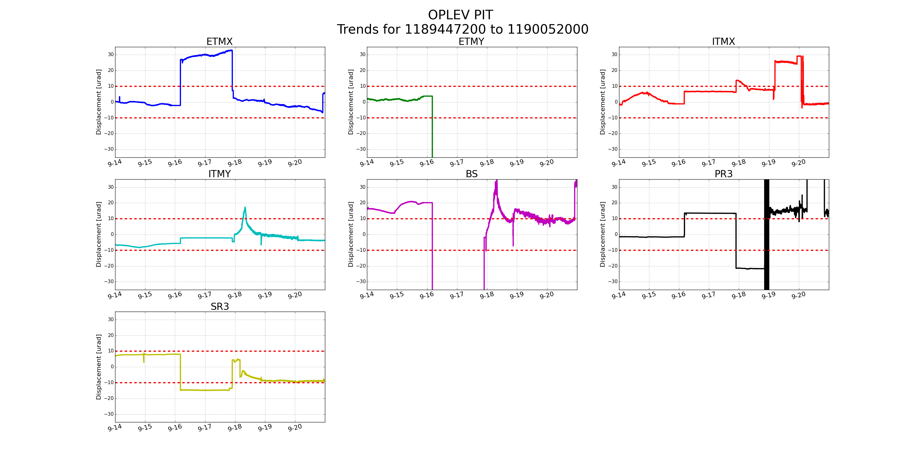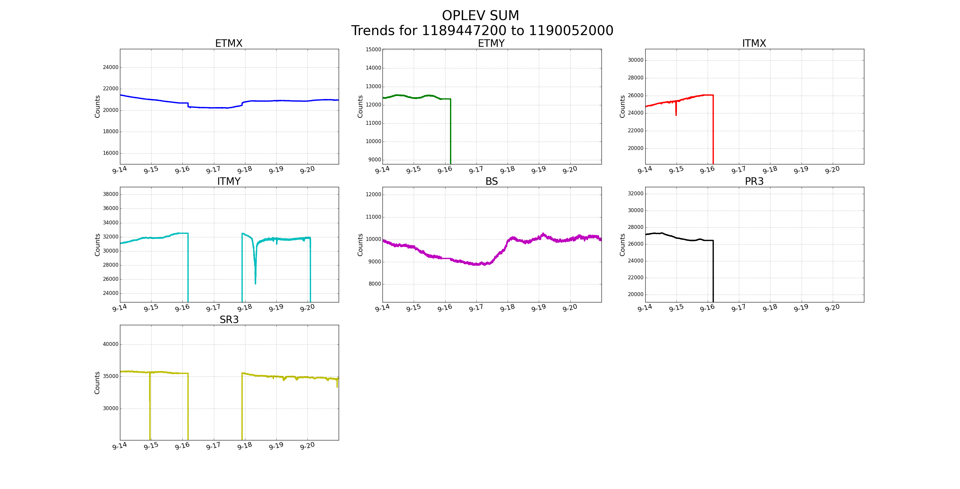TITLE: 09/20 Day Shift: 15:00-23:00 UTC (08:00-16:00 PST), all times posted in UTC STATE of H1: Planned Engineering LOG: Appears that Bubba and crew are in bier garten and Jeff B. is in LVEA. Peter is in the PSL enclosure. 15:21 UTC Hugh to LVEA to survey HEPI 15:30 UTC Filiberto moving SUS chassis from rack on high bay side of HAM6 to rack on other side and rerouting cables with them. 15:36 UTC Richard to LVEA to work with Filiberto. 15:41 UTC Rick to LVEA to work with Hugh 16:04 UTC Travis to LVEA to take cameras off HAM3 16:28 UTC Travis back 16:47 UTC Richard back. Filiberto dressing tip tilt cables. Rick in HAM2 removing ISS array 17:39 UTC Betsy and Travis to inspect BSC3 17:41 UTC Door being craned (on camera) 17:46 UTC Richard to LVEA to see Fil 17:55 UTC Karen to end Y 17:56 UTC Jeff and Sheila to HAM2 to install last of ISI damper mechanisms 18:10 UTC Gerardo to end Y to pick up TMDS part 18:31 UTC Karen leaving end Y, going to mid Y 18:47 UTC Corey to LVEA to distribute clean tools 18:57 UTC Karen leaving mid Y, going to end X 19:03 UTC Corey back One door off of HAM3 19:33 UTC Karen leaving end X 21:04 UTC Corey to squeezer bay 21:44 UTC Rick taking visitors through LVEA 22:00 UTC Site weekly meeting