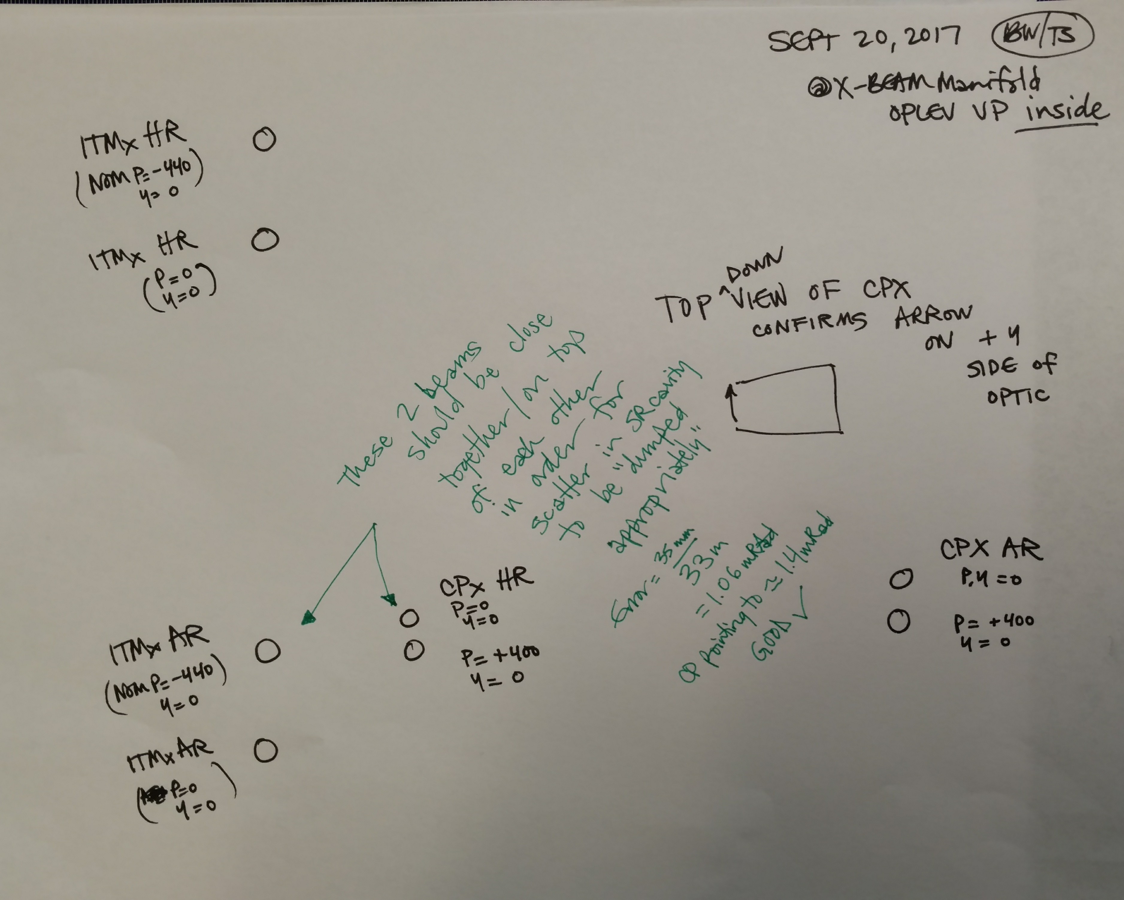 Yesterday, Travis hoofed it down the x-beam manifold from inside of BSC3 to the ITMx OPLEV viewport and mapped the red beams heading toward the receiver. Only the ITMx-HR main beam and some small ghosts were exiting the viewport, the other main beams were trapped by the manifold spool piece. Attached is the map. It looks like the CPx-HR and the ITMx-AR surface beams are close together, as they should be - measured to be ~1.06 mRad away from each other in yaw, and far less in pitch. (The CP pointing tolerance is ~1.4mRad so this is "within" spec.) This is good news and means that the back reflections from the CP which go back down towards the input arm should be ~appropriately dumping on baffles when it's all put back together. We'll try to check during upcoming alignment exercises.