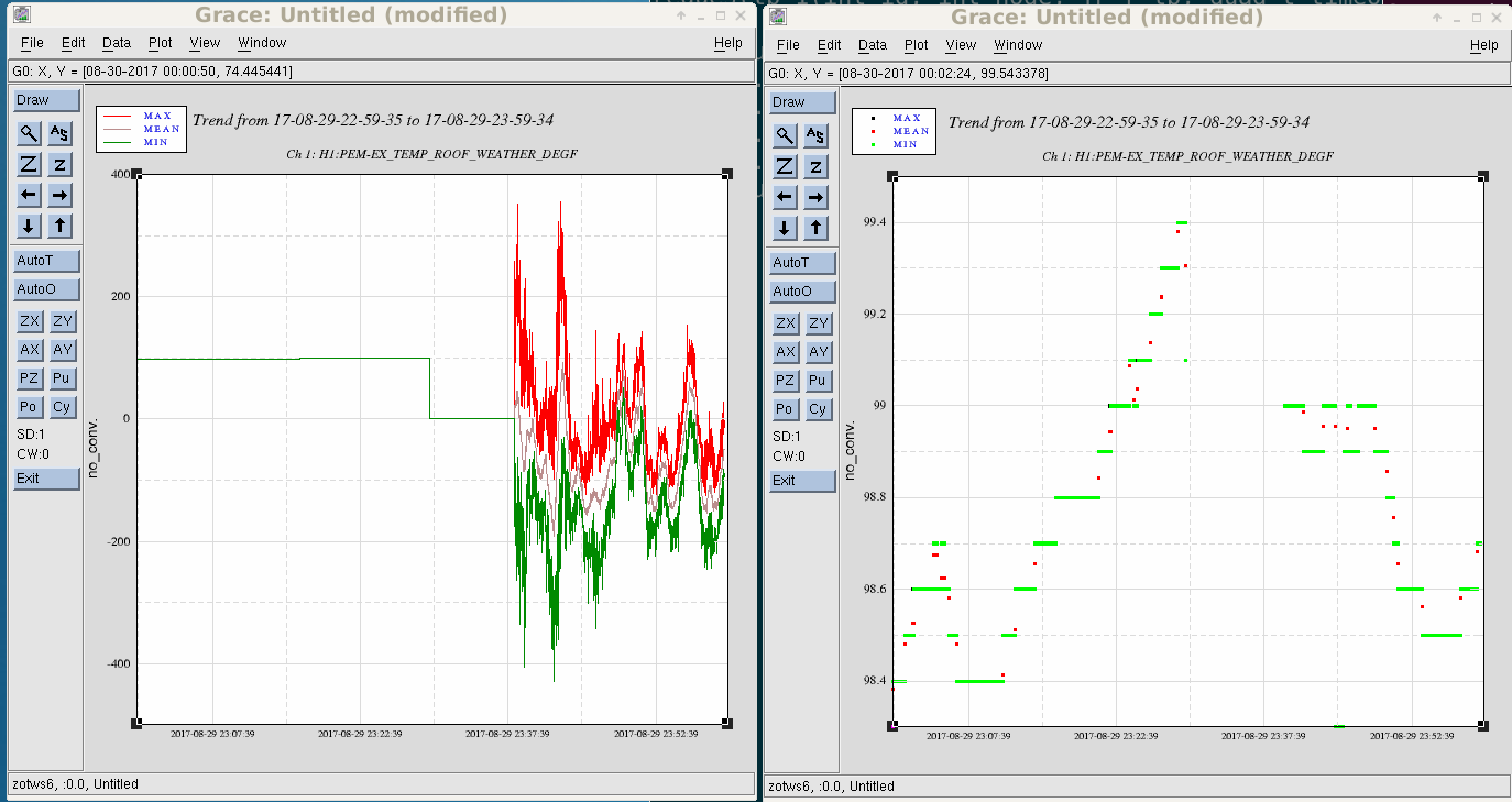 The attached dataviewer one hour second trend plots of the EX building outside temperature spanning yesterday's DAQ restart show a before and after this fix was applied. Before the fix the temperature went from 99F to +/-400F, after the fix the correct temperature is shown with a 10 minute data gap.