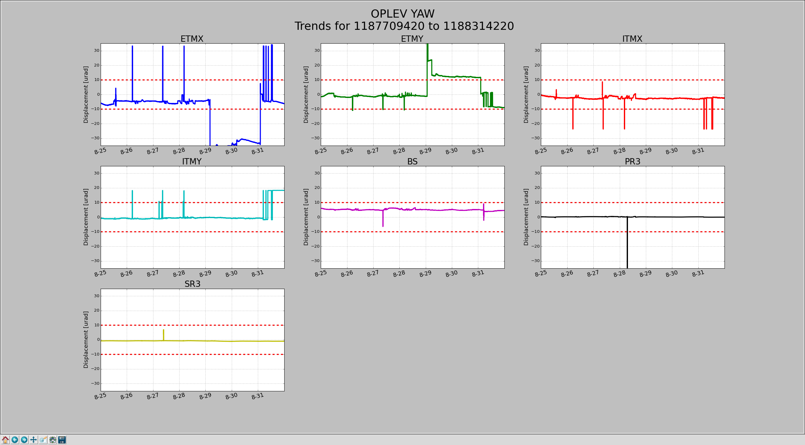 As can be seen from the attached 2-hour trend, both ITMy and ETMx have been in both the Aligned and Misaligned state recently, likely due to ongoing comminssioning activities. Both are now Aligned, as a locking attempt is being made, and the pitch and yaw values of the oplevs are well within spec.