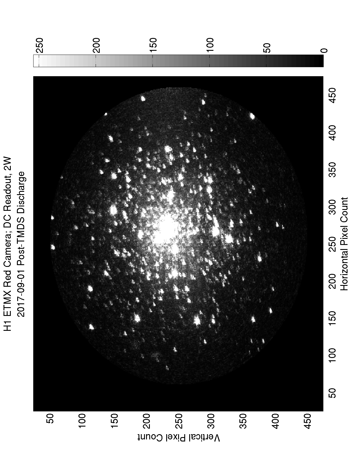 J. Kissel Even though we no longer suspect there's anything wrong with the ETMX test mass after discharging on Tuesday and Wednesday (aLOGs with convincing refuting evidence to come from Sheila and Thomas; see claims of suspicion in LHO aLOG 38476), I've gathered some digital red camera images from the camera archive, /ligo/data/camera/archive/2017/09/01/ H1 ETMX (h1cam25)_2017-09-01-22-04-39.tiff (or without the linux handling of badly used characters 'H1 ETMX (h1cam25)_2017-09-01-22-04-39.tiff') /ligo/data/camera/archive/2017/08/29/ H1 ETMX (h1cam25)_2017-08-29-02-02-08.tiff ('H1 ETMX (h1cam25)_2017-08-29-02-02-08.tiff') imported them into matlab (I'm still using the workstation's default version 8.0.0.783 [R2012b]), [dcreadout_0829,~] = imread([imageDir{1} 'H1 ETMX (h1cam25)_2017-08-29-02-02-08.tiff']); [dcreadout_0901,~] = imread([imageDir{2} 'H1 ETMX (h1cam25)_2017-09-01-22-04-39.tiff']); and subtracted the images, difference_ETMX = (dcreadout_0829 - dcreadout_0901); and plotted them, e.g. figure(1); imagesc(dcreadout_0829); colormap(gray); just to see if there were any major changes in point scatters because of the TMDS use. There is no major change in point scatters as a result of the use of the TMDS system on ETMX.