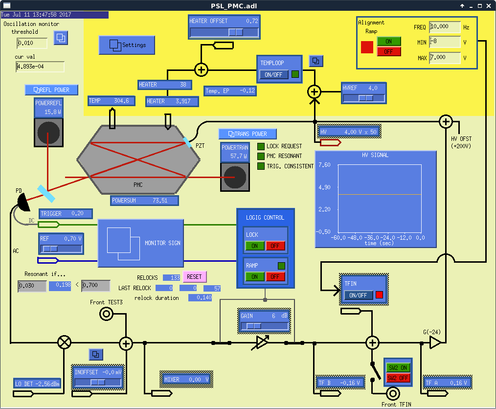 I have made a number of medm screens for this new system. The attached are screenshots of a couple of the new medms. When we locked the interferometer with a low power (~2W) after the maintenance today, I briefly tried phase-locking the audio modulation signal at 205 Hz, but didn't really succeed. We will continue commissioning them later.