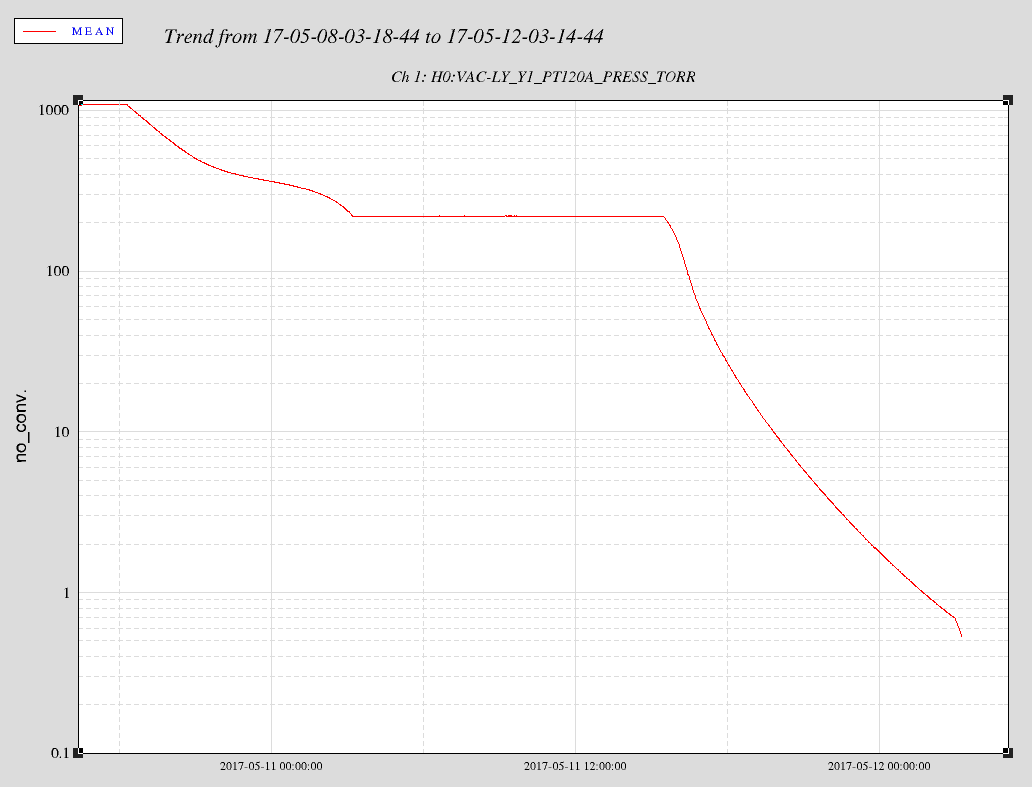 | 6637 | 5/12/2017 8:40 | The pirani gauge is not functioning properly and not allowing the Cold Cathode to turn on. We will force the Value of COLD_CATHODE_HIGH_LIMIT_TORR to 1 to allow the Cold cathode to turn on. This will be in place until we vent and can replace the guage. | |
